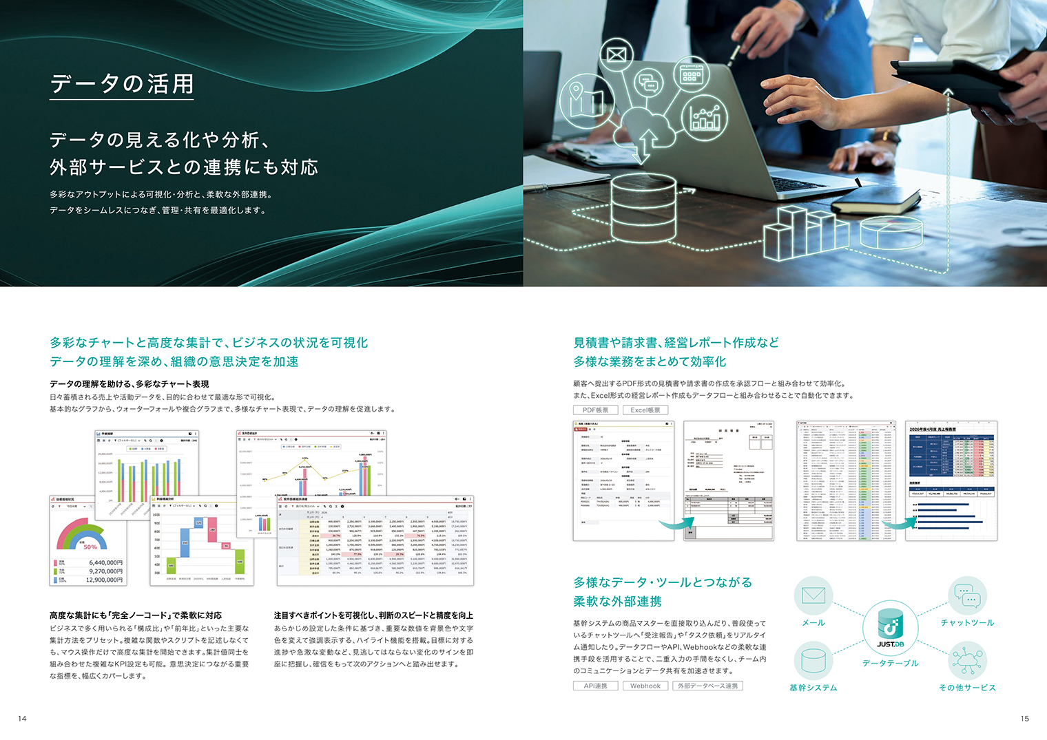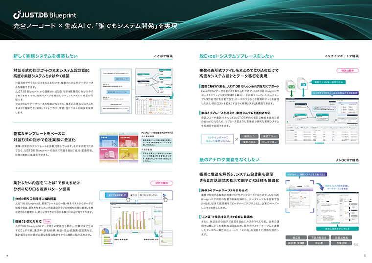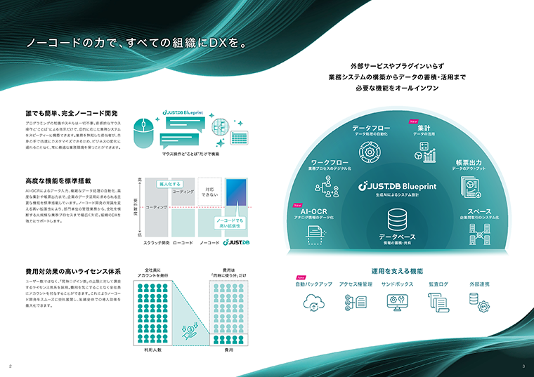 生成AIを活用した「JUST.DB Blueprint」や、高度なワークフロー、データの自動処理、帳票出力など、豊富な標準機能を詳しく解説します。 - コスト抑制につながるライセンス体系