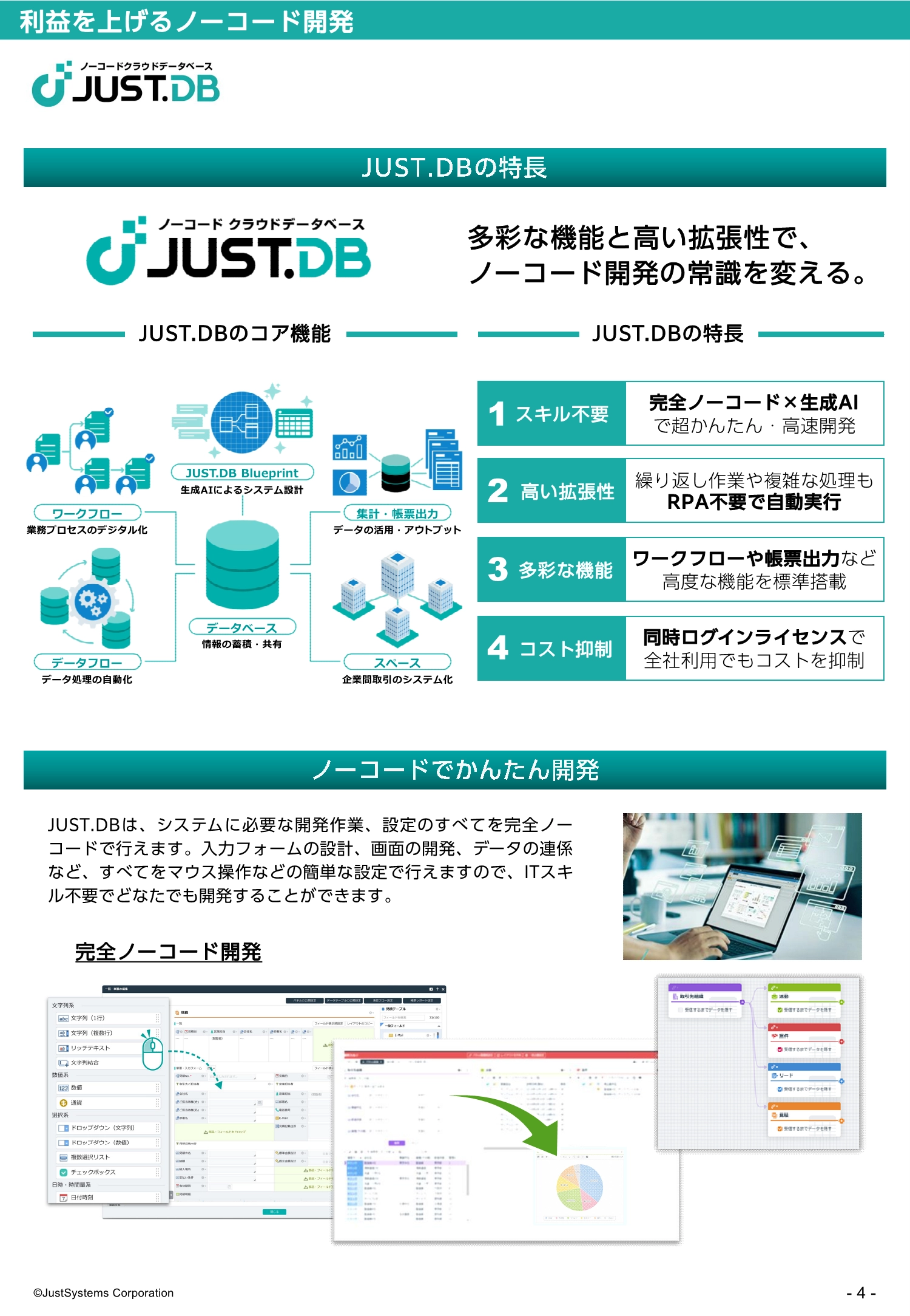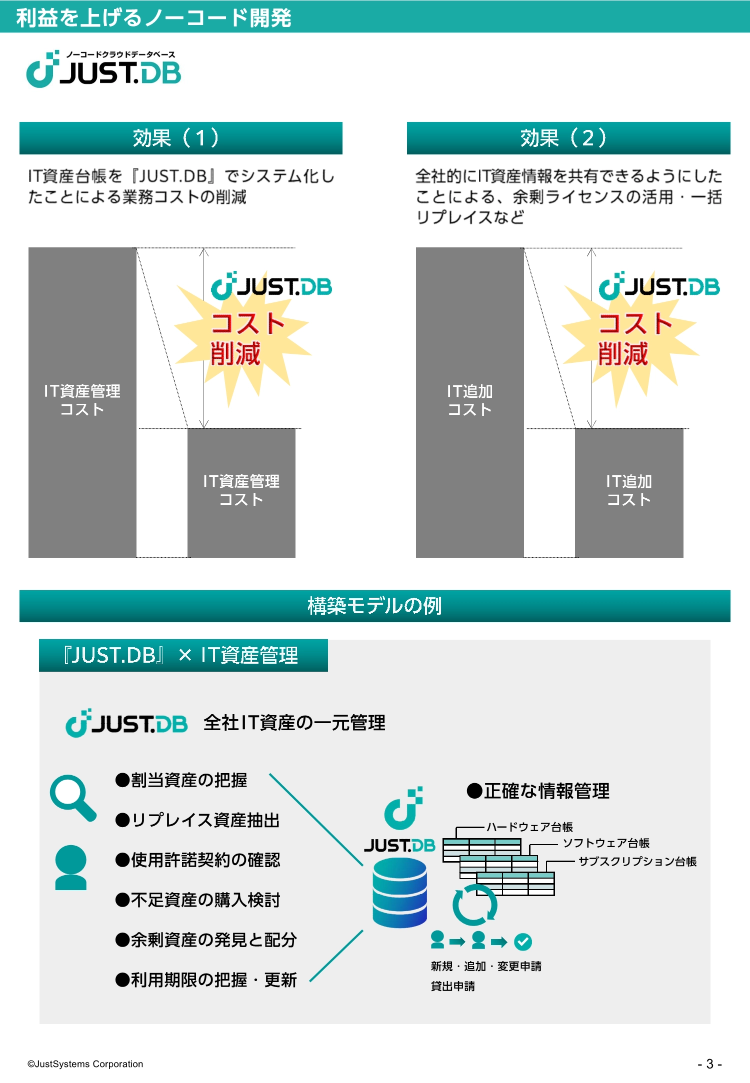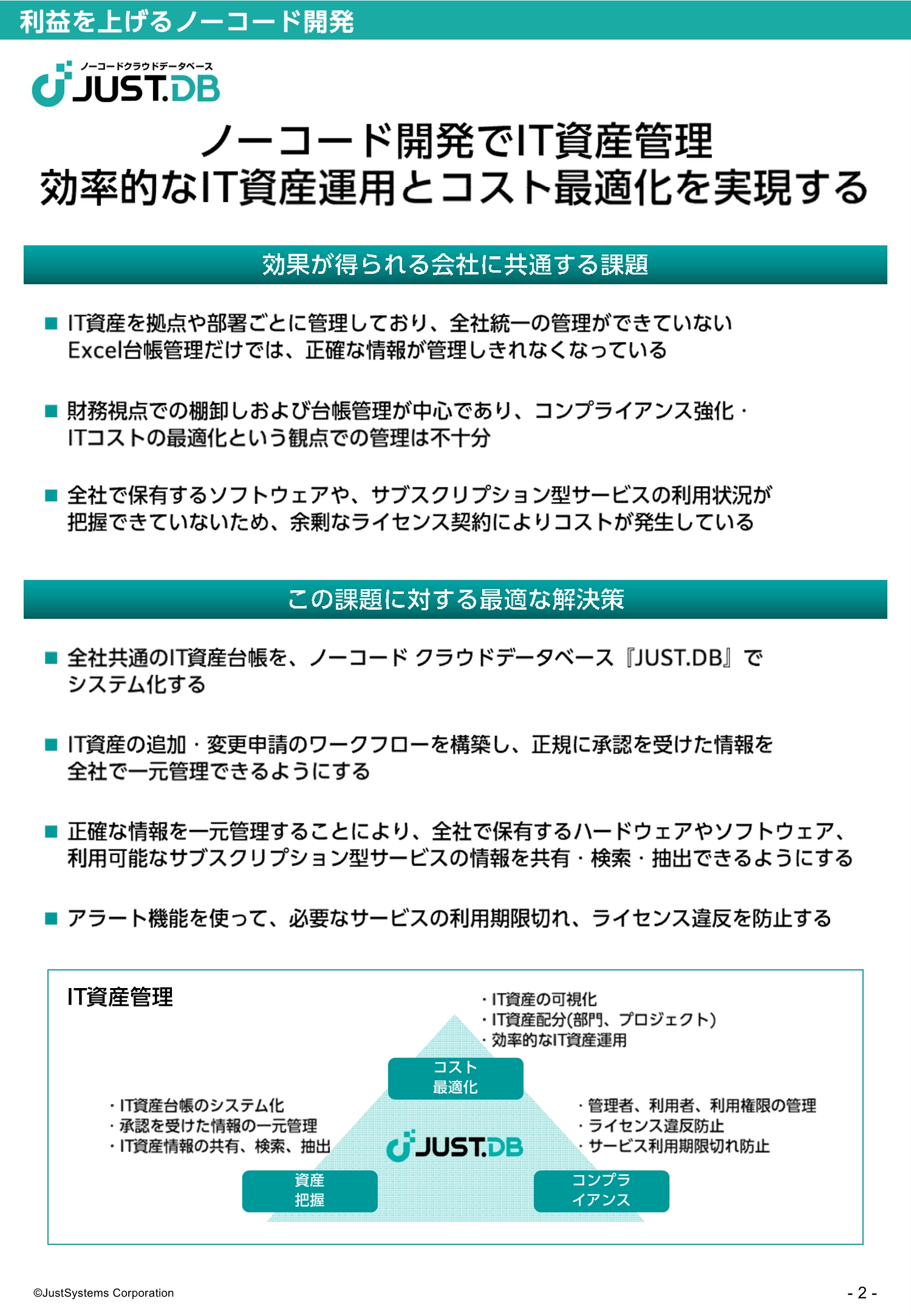 本資料では、特別なITスキルがなくても、必要な業務システムを現場で作ることができるノーコード開発ソリューション「JUST.DB」を活用して、IT資産管理に関する業務を改善する方法をご紹介しています。
