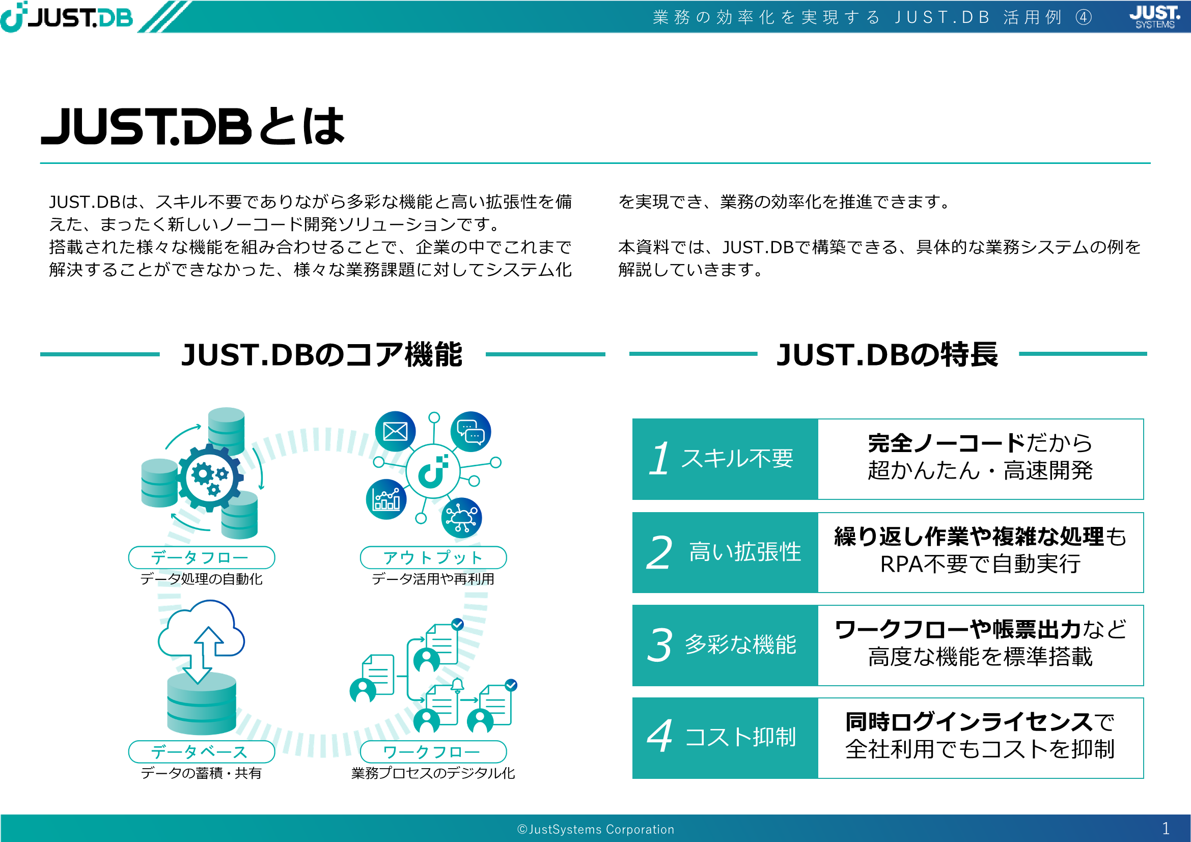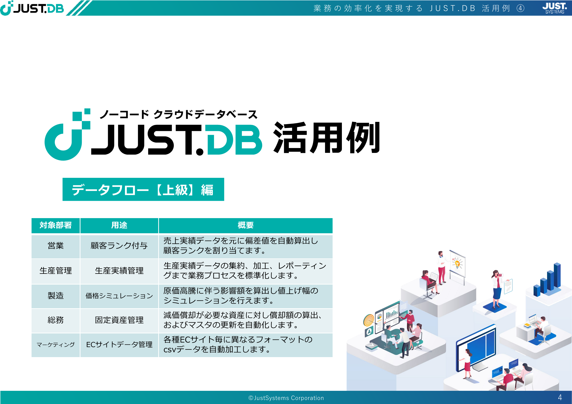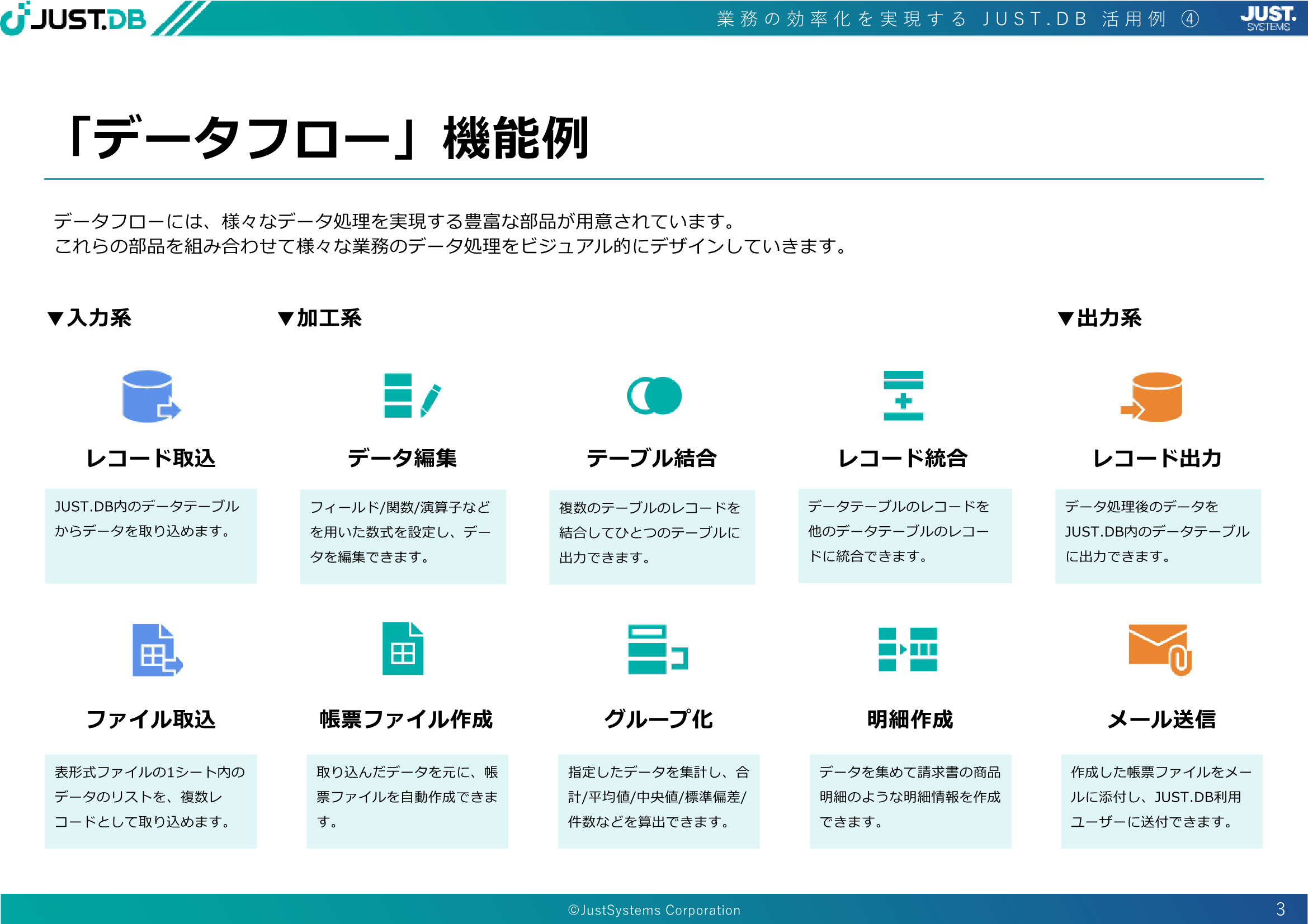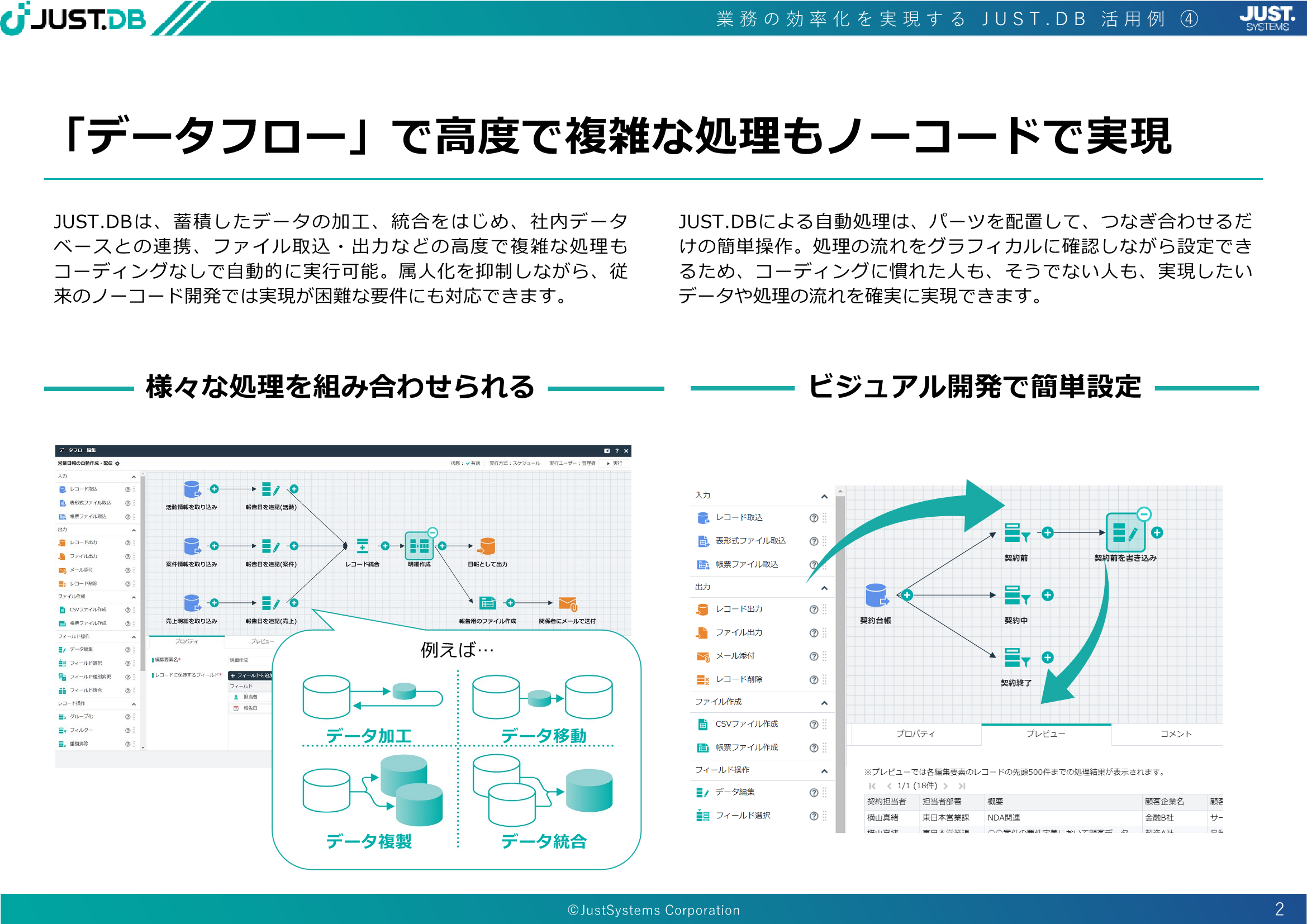 さまざまな業務システムを完全ノーコードで構築できる「JUST.DB」は、情報の蓄積や、共有のためのデータベースを作るだけでなく、定型のデータ処理を自動化する「データフロー」機能を搭載しています。