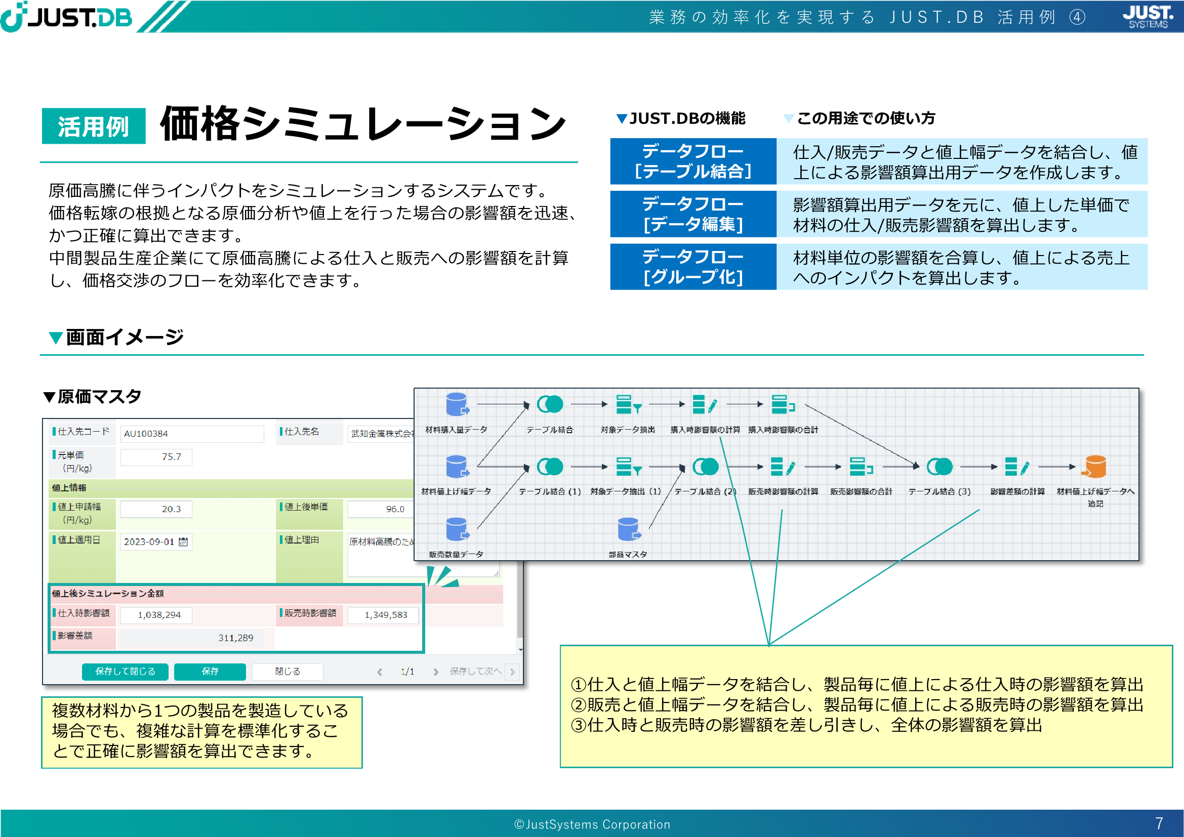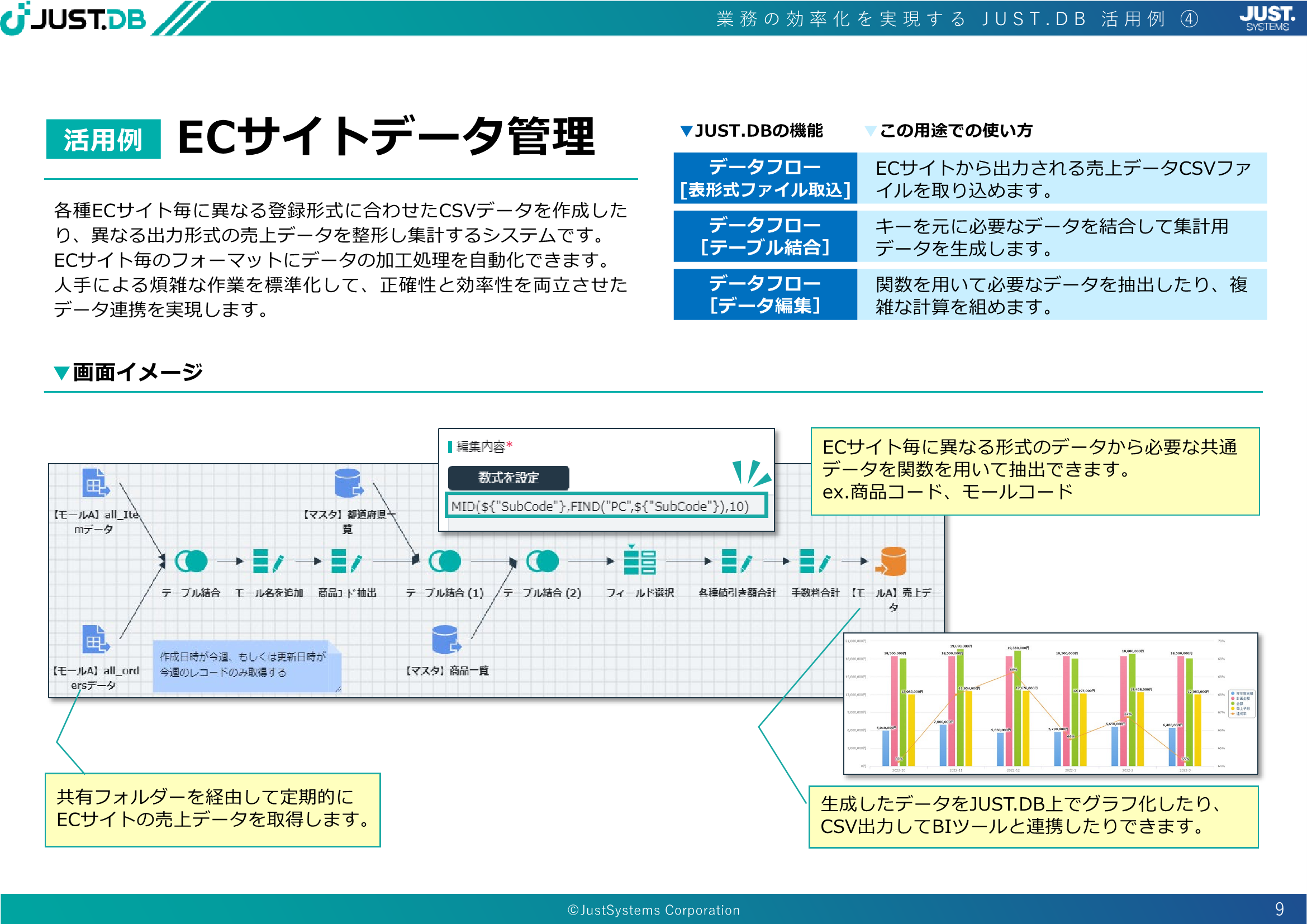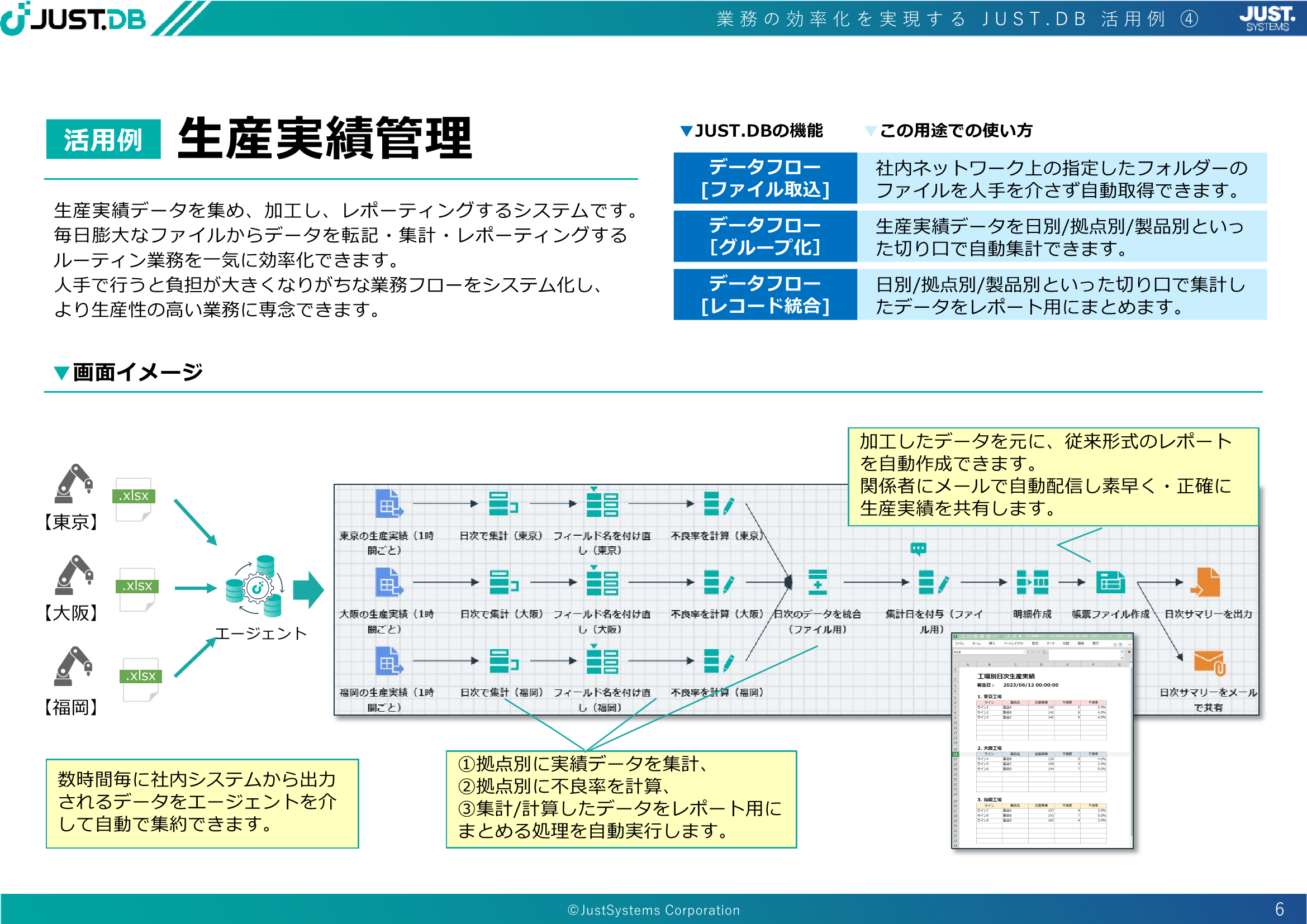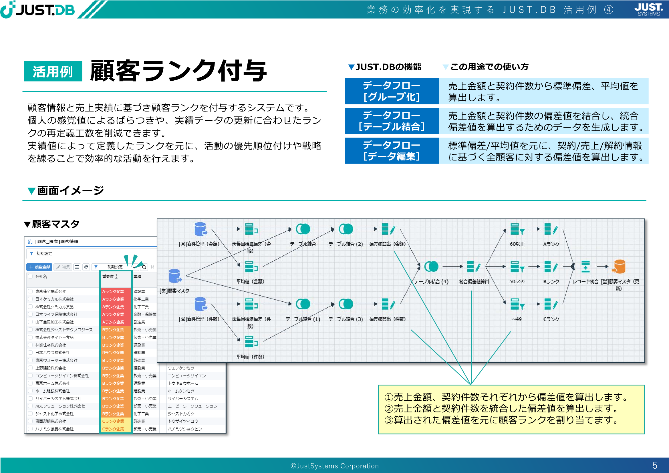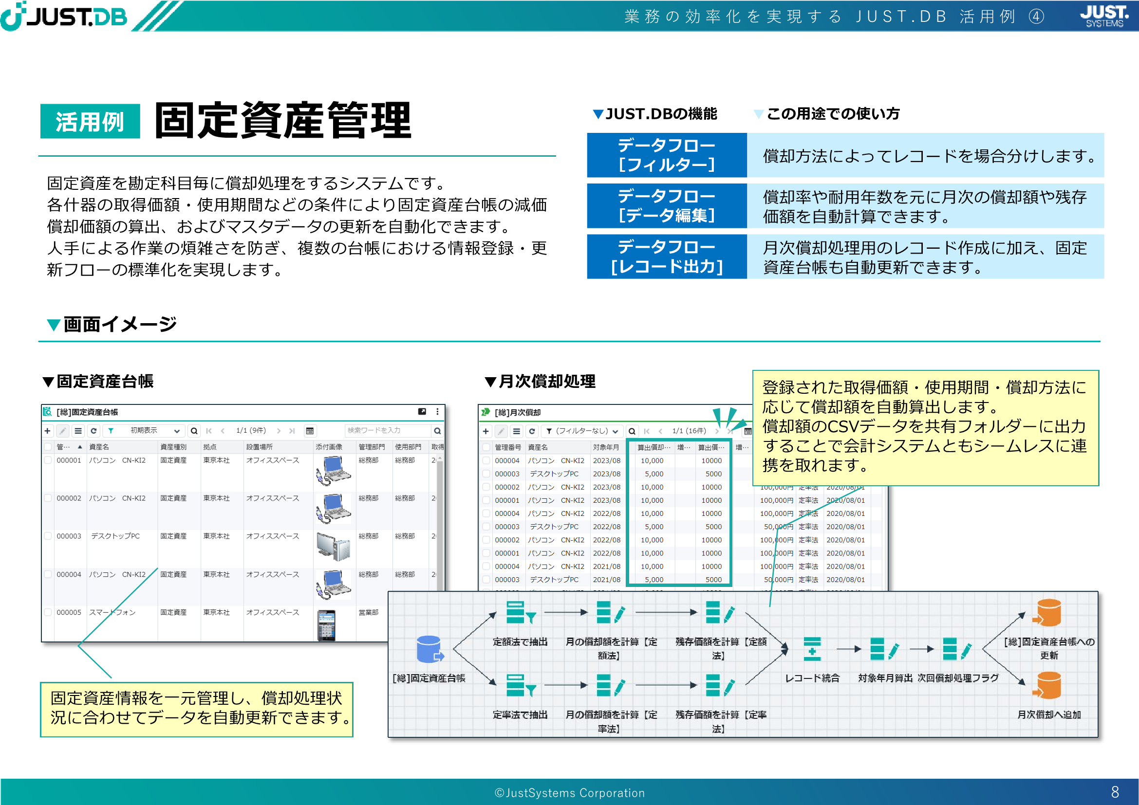 さまざまな業務システムを完全ノーコードで構築できる「JUST.DB」は、情報の蓄積や、共有のためのデータベースを作るだけでなく、定型のデータ処理を自動化する「データフロー」機能を搭載しています。