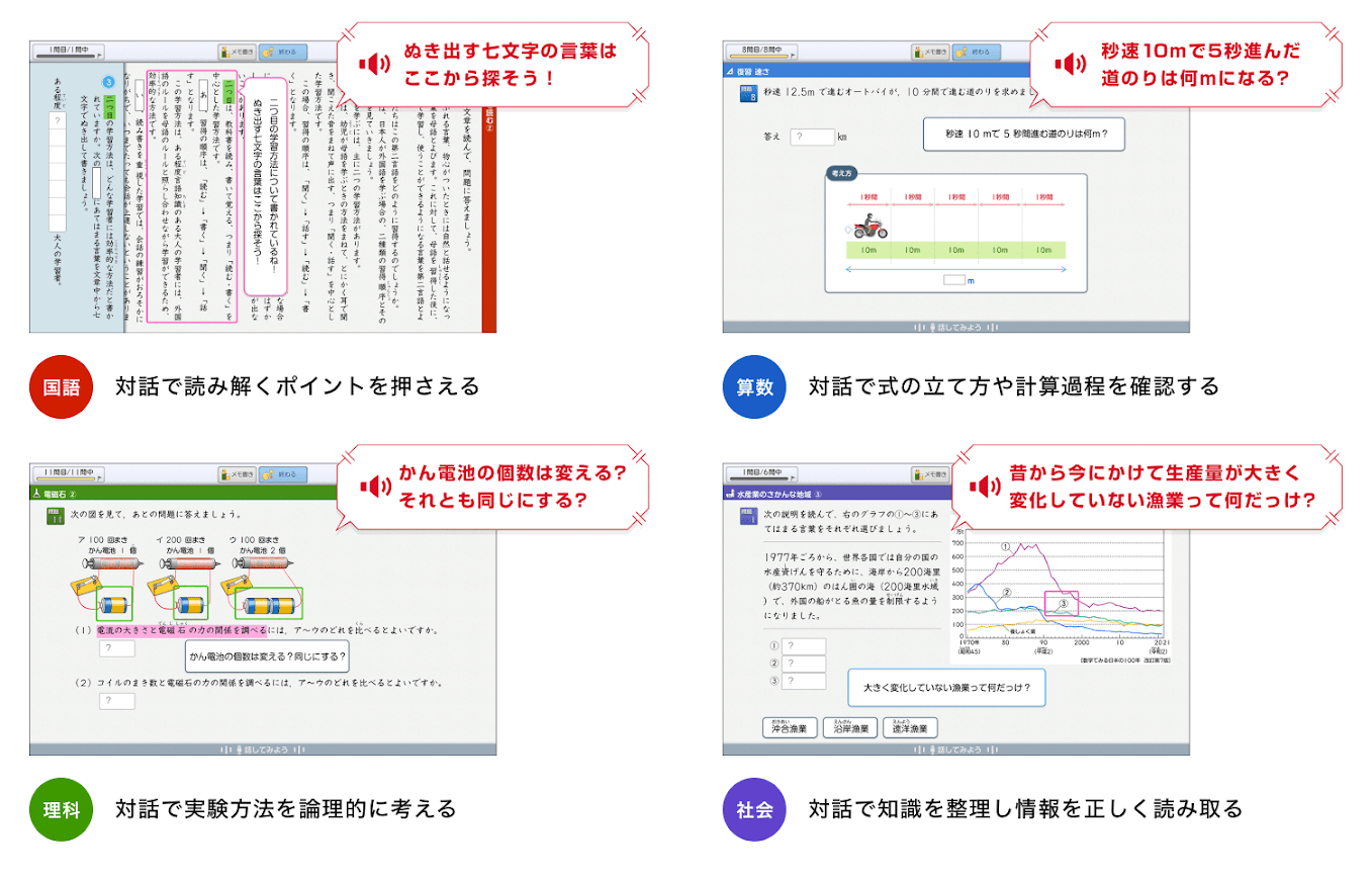 主要4教科(国語、算数、理科、社会)に対応し、それぞれの特性に合わせた対話型の学習を通して、自ら答えを導き出す力を育てます。