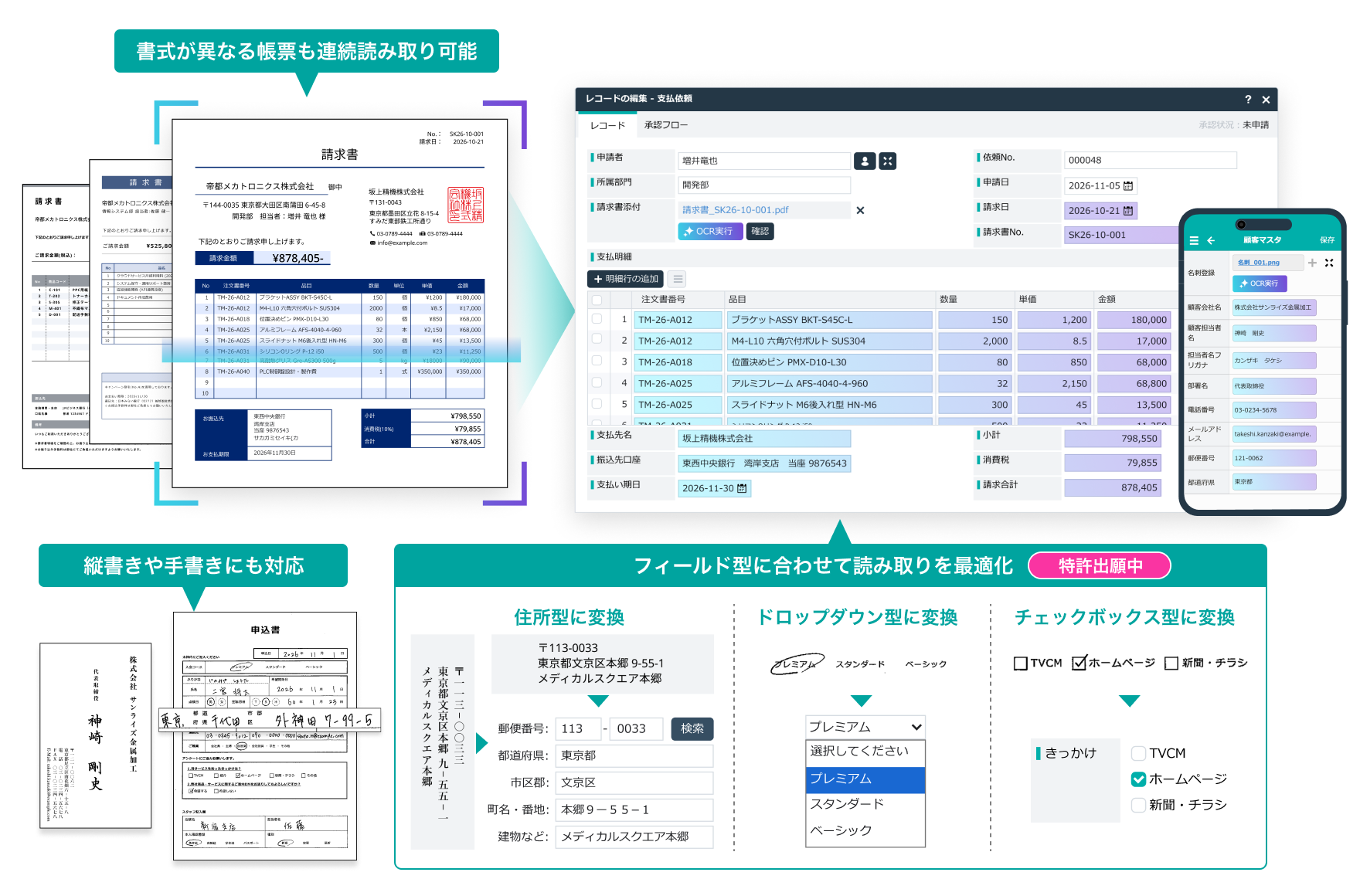 「AI-OCR」は、紙の書類やPDF帳票などの情報を即時にデータ化し、あらゆる部門の業務を効率化します。例えば、営業部門の名刺管理や、経理部門の請求書処理において、手入力によるミスや工数を削減できます。取引先ごとに書式が異なる請求書や手書きアンケートも、読み取り枠の定義なしでそのままデータ化が可能です。丸囲みやチェックマークといった構造化が難しいデータも自動で判別し、高精度に読み取ります。これらの処理は「JUST.DB」上で直接実行できるため、データの読み取りから蓄積、検索・集計・レポートといった活用まで、シームレスな業務プロセスを実現します。