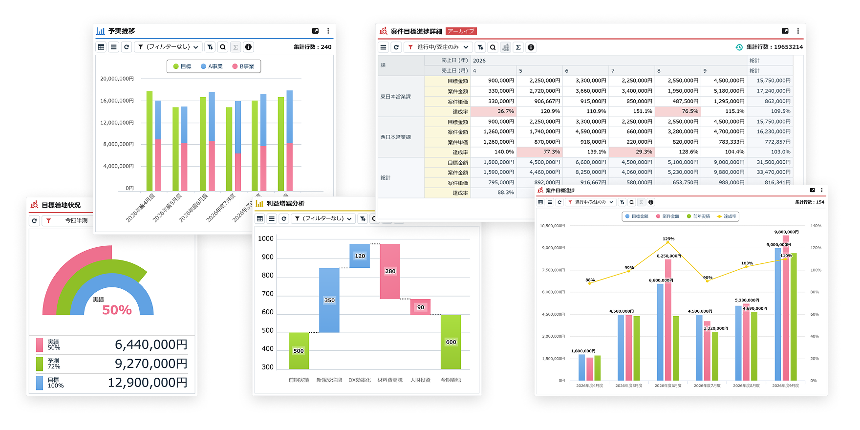 「JUST.DB」の集計機能が最大2,000万件の大規模データに対応し、全社規模の分析基盤へと進化しました。また、集計の表現力も大幅に強化しています。集計表のセル色を自動で変える「ハイライト」機能により、重要な指標の変化を一目で把握可能にします。さらに、売上などの増減要因を可視化する「ウォーターフォール」や、異なる指標を重ねる「複合グラフ」にも対応しました。数字の羅列では見落としがちな傾向を、直感的なビジュアルで可視化します。こうした高度な集計も、生成AIによる設計機能「JUST.DB Blueprint」に「エリア別の売上推移が見たい」と指示するだけで、最適なグラフや表を即座に提案します。Excelでは設定が煩雑な複合グラフや要因分析も自動生成により迅速化し、次のアクションに向けた意思決定を支援します。