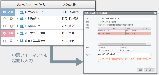 GDMS上でアクセス権やフォルダーに関する設定変更を申請・承認でき、運用をかんたんにシステム化することができます。ファイルサーバーの効率的な利用を促進し、情報システム部門の作業負担を大幅に軽減します。