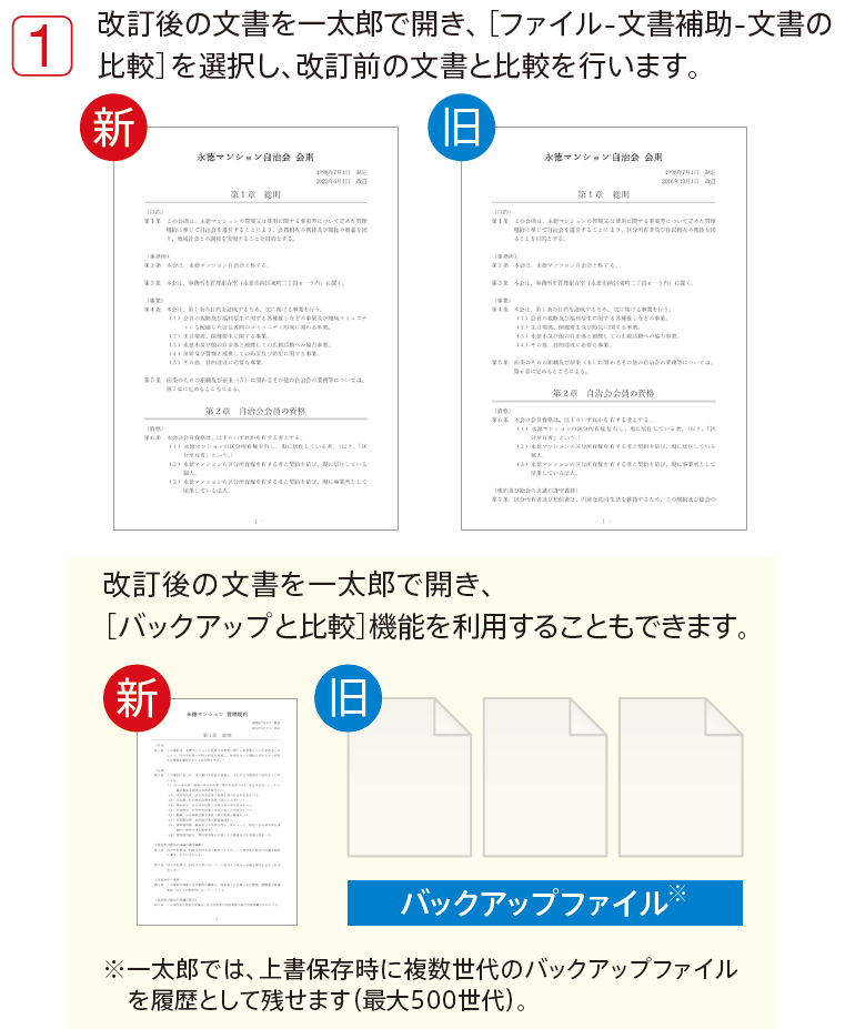 新旧の文書ファイルを指定する方法だけでなく、一太郎の[バックアップと比較]機能を用いて改訂前のバックアップファイルを指定して相違点の比較を行うことができます。