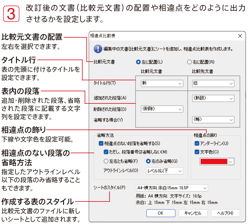 また、文書をバックアップと比較して、「新旧対照表」などを自動的に作成できる「相違点比較表」の機能も搭載されています。