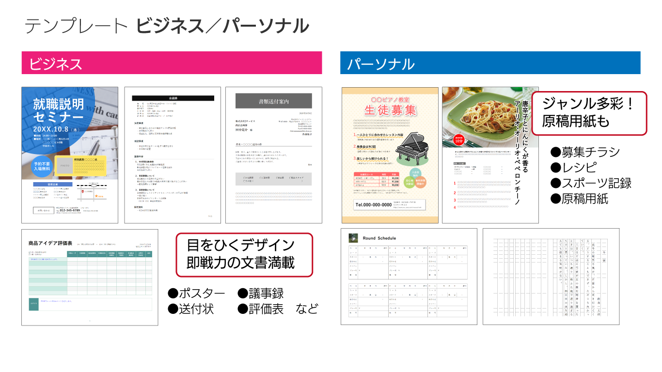 見出しや本文のスタイル、配色や写真の配置箇所があらかじめ整えられたテンプレートを搭載。ビジネス、パーソナルそれぞれの利用シーンを幅広くカバーしています。