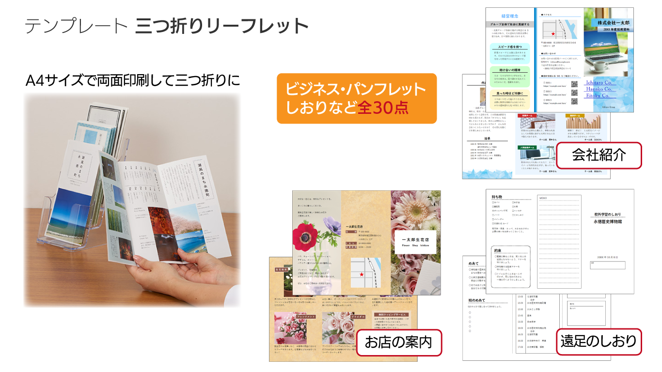 1枚のA4用紙に両面印刷して3つに折るとできあがる、リーフレット用のテンプレート30点を搭載。