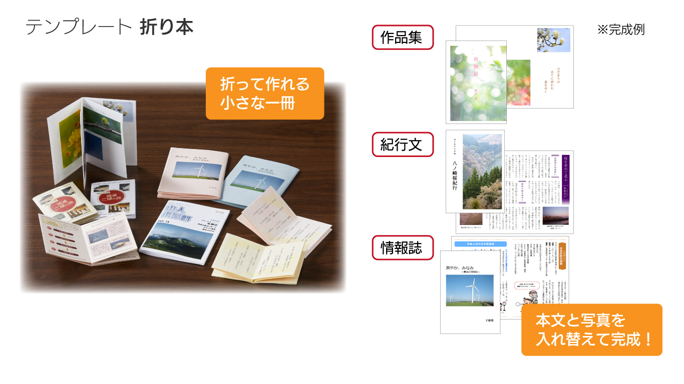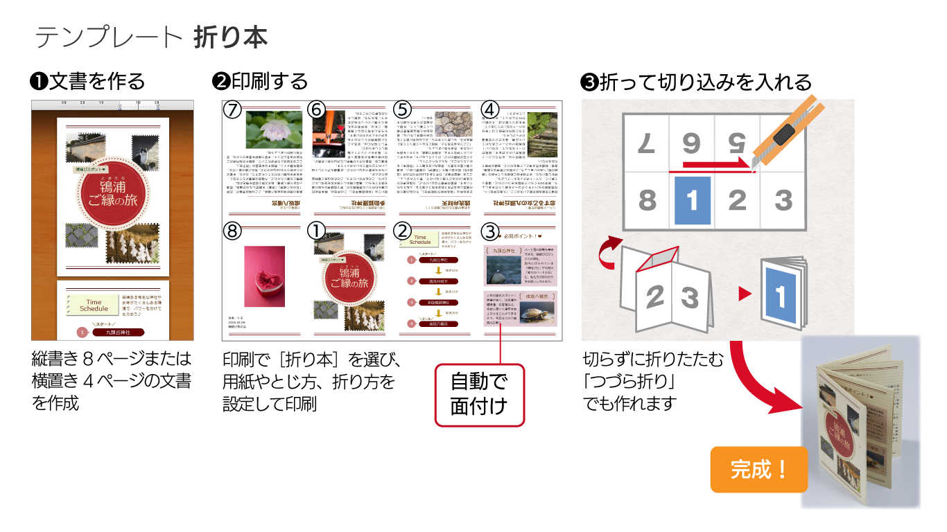 一枚の紙を切ったり折ったりしてつくる、手軽でおしゃれなペーパーアイテムの折り本が簡単に作れます。仲間内での旅の思い出記録やフリーペーパーや告知、ミニ情報誌など活用法はさまざまです。