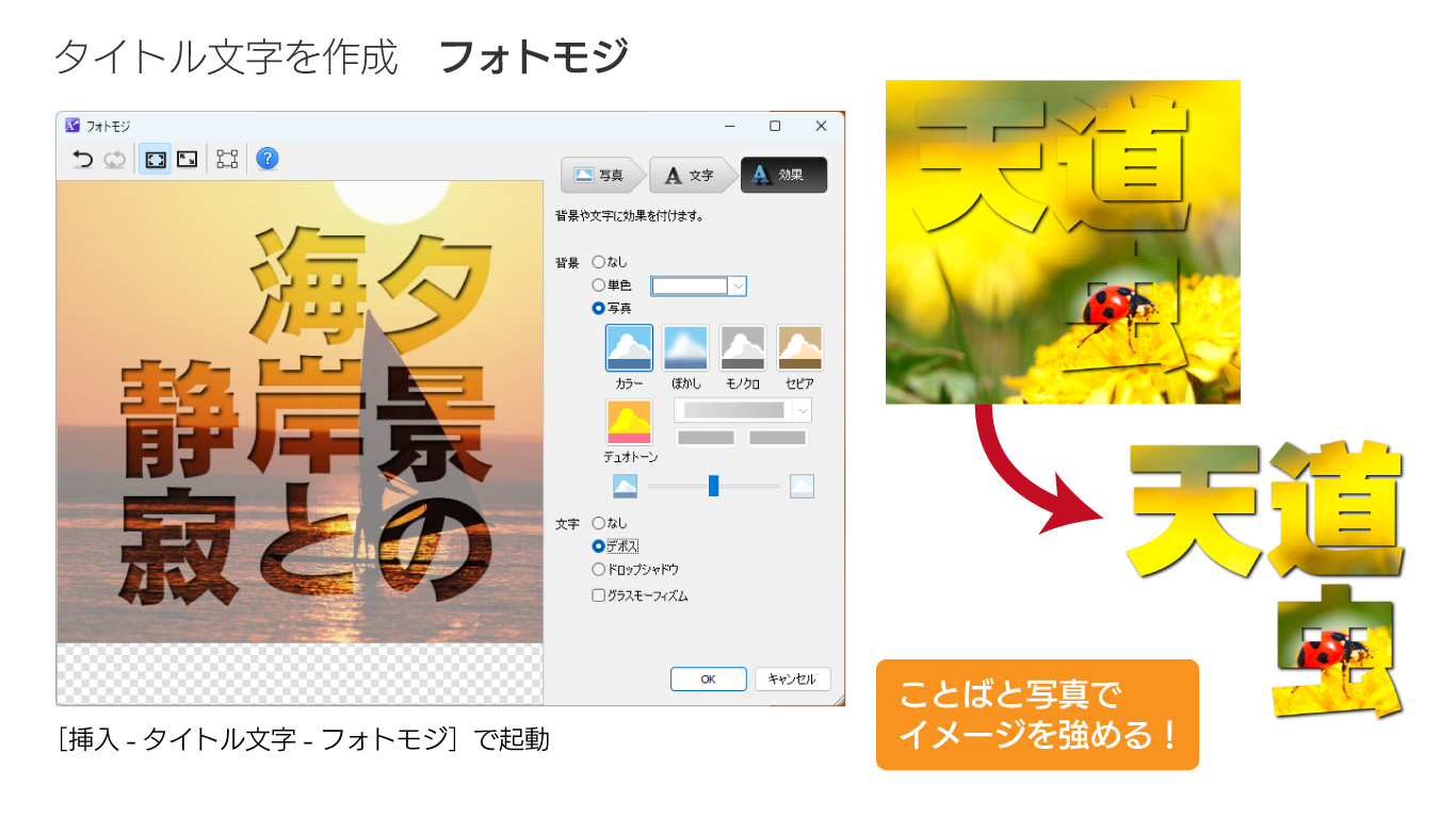 ベースにしたい画像、使いたいタイトルやキャッチコピーなどの文字列を決めて、さまざまな効果をプラス。