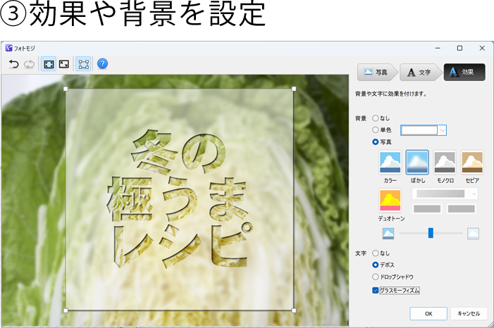 写真を選んで文字や効果を設定。フォントや背景の有無、設定した効果などは、左側の編集画面にすぐ反映されます。切り抜いた画像に透過を設定することも可能です。