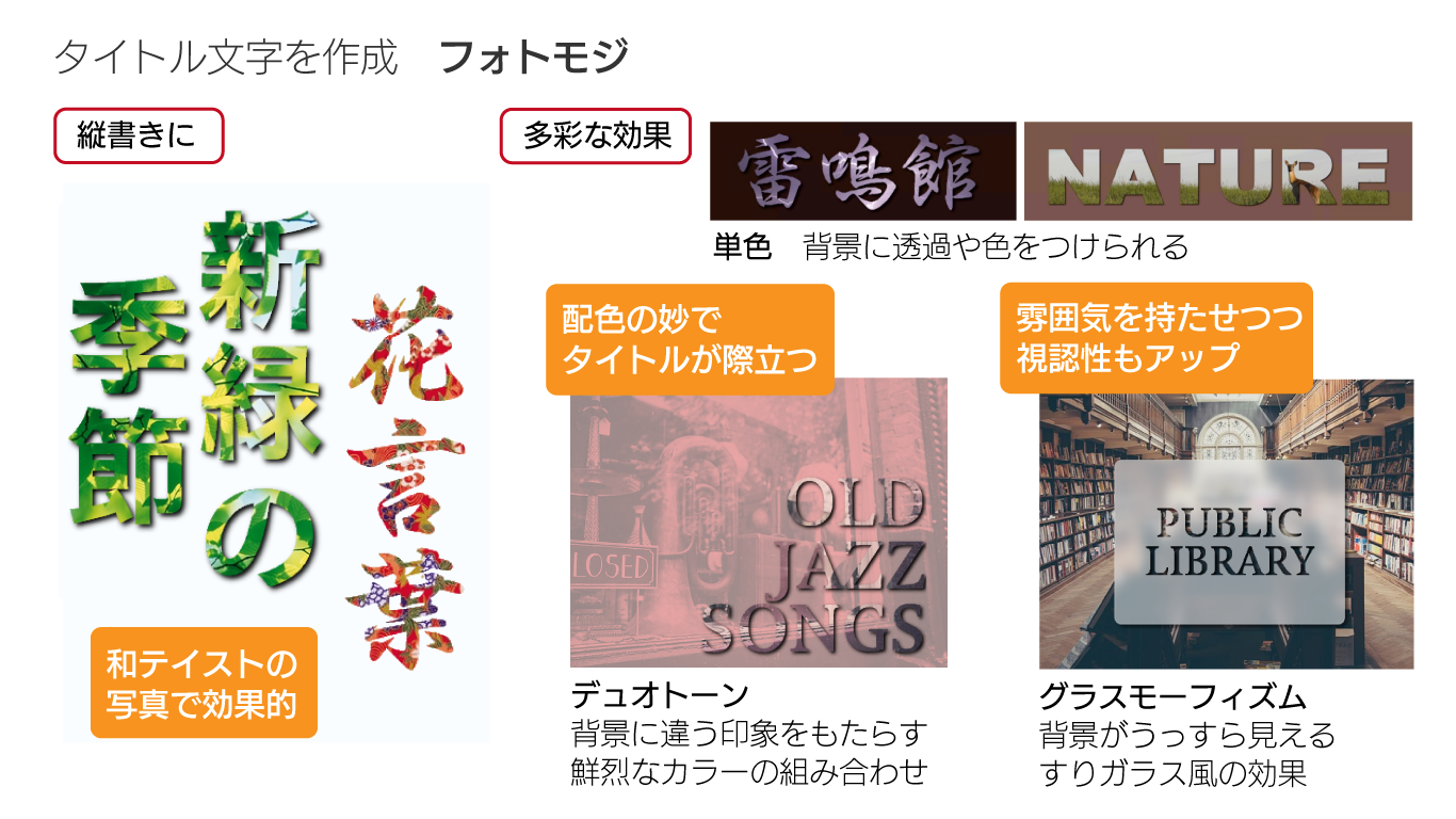 企画書、チラシ、冊子などで見出しやタイトルを写真のイメージに合わせて印象づけるのに効果的です。