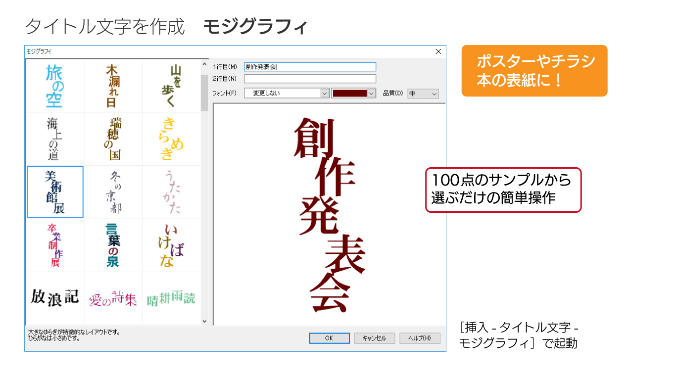 一太郎上で完結するタイトル文字の作成ツールを活用すれば、あなたのアイデアを美麗な形で表現できます。