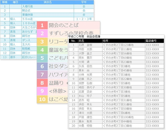 名簿や各種プログラム、ランキング表など連番を付けた表を作成するのに適しています。