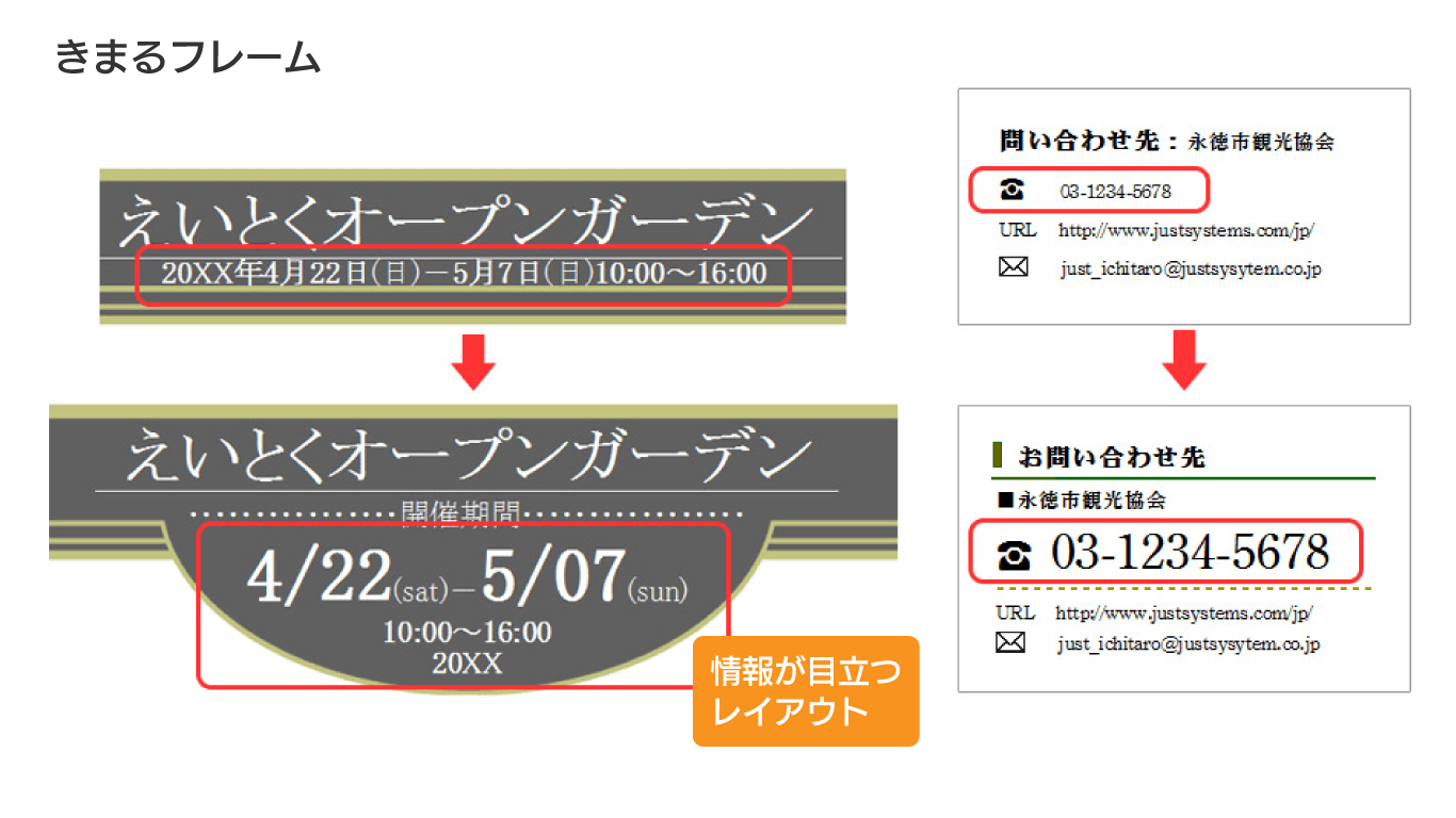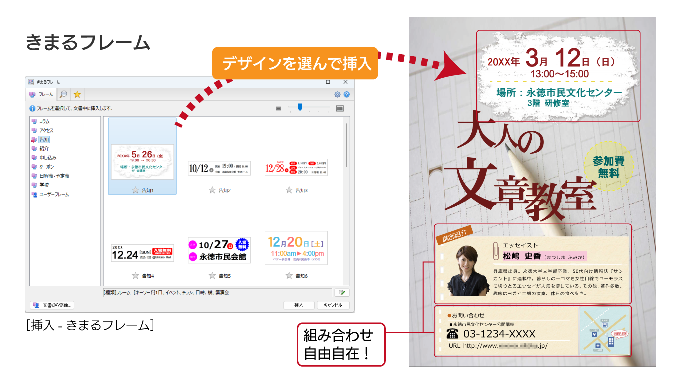 収録されているフレームは、「告知」「アクセス」といった記載の用途に応じて、より伝えたい情報が際立つよう、あらかじめレイアウトされています。伝えたい情報が伝わりやすい文書を、簡単につくることができます。