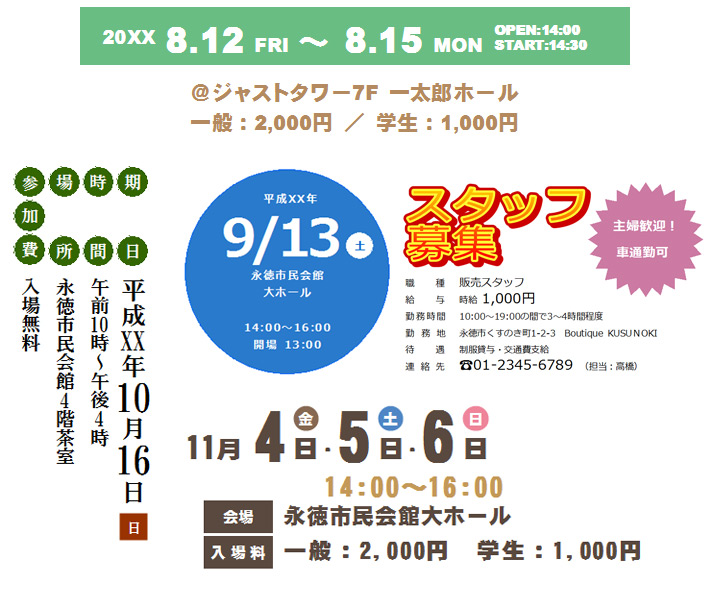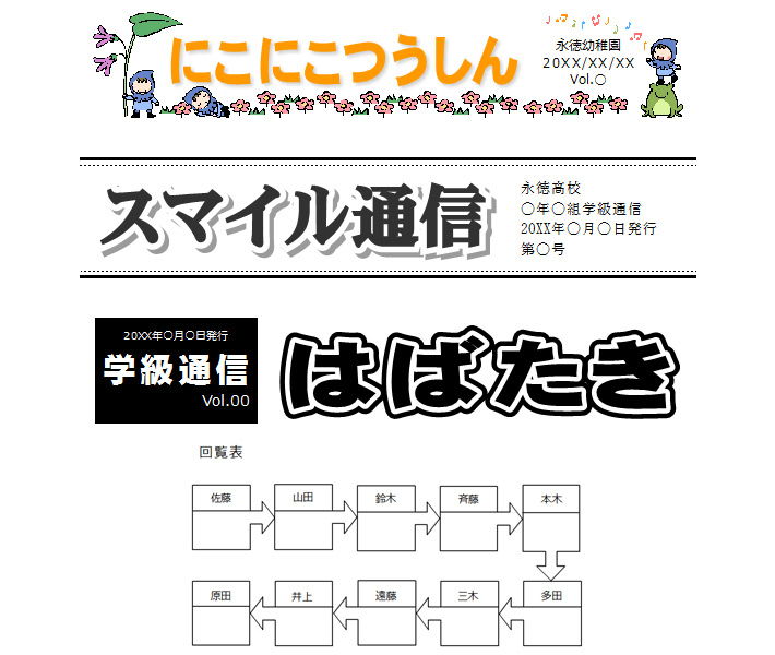 - 会報、学級便り、チラシ、フライヤー、掲示、手紙