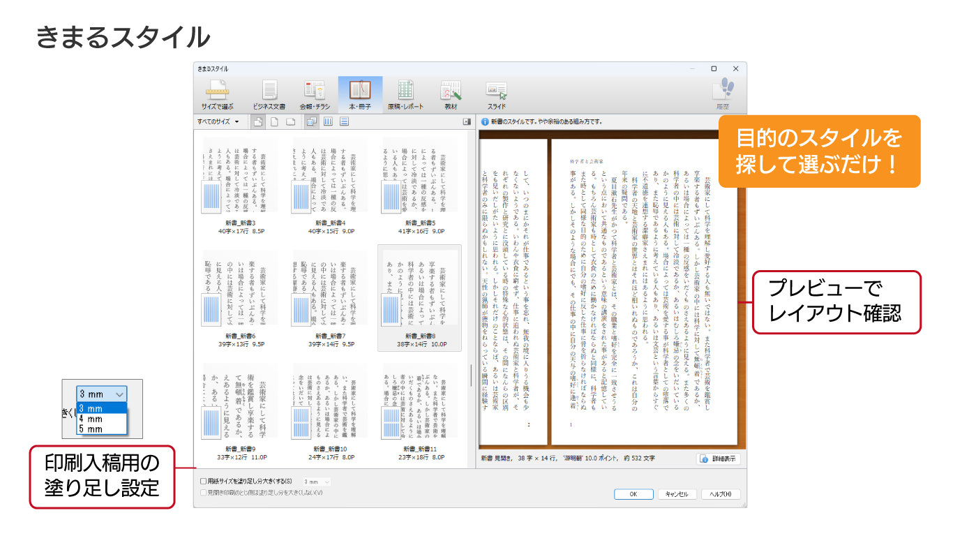 一太郎の「きまるスタイル」を使えば、企画書、報告書、会報、学級便り、冊子、単行本、文庫本、新書など、用紙サイズや用途に合った最適なレイアウトを一発で選べます。
