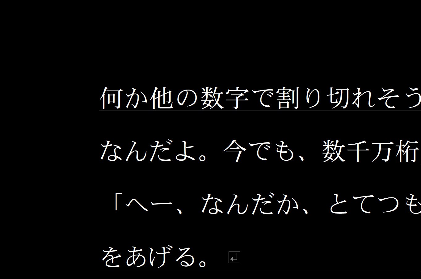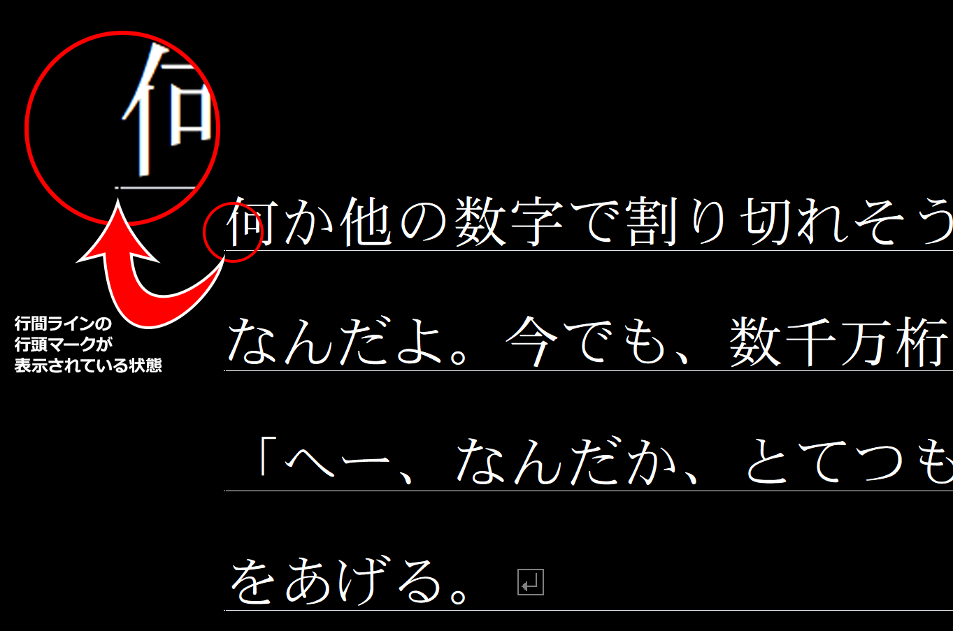 画面の背景色を変更した場合などに、行間ラインの行頭・行末マークが気になる場合には、非表示に切り替えられます。表示内容に気を取られることなく、執筆作業に取り組むことができます。