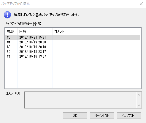 「バックアップから復元」を表示すると、自動バックアップされたファイルを一覧できます。日時を確認して、修正前の状態に戻せます。