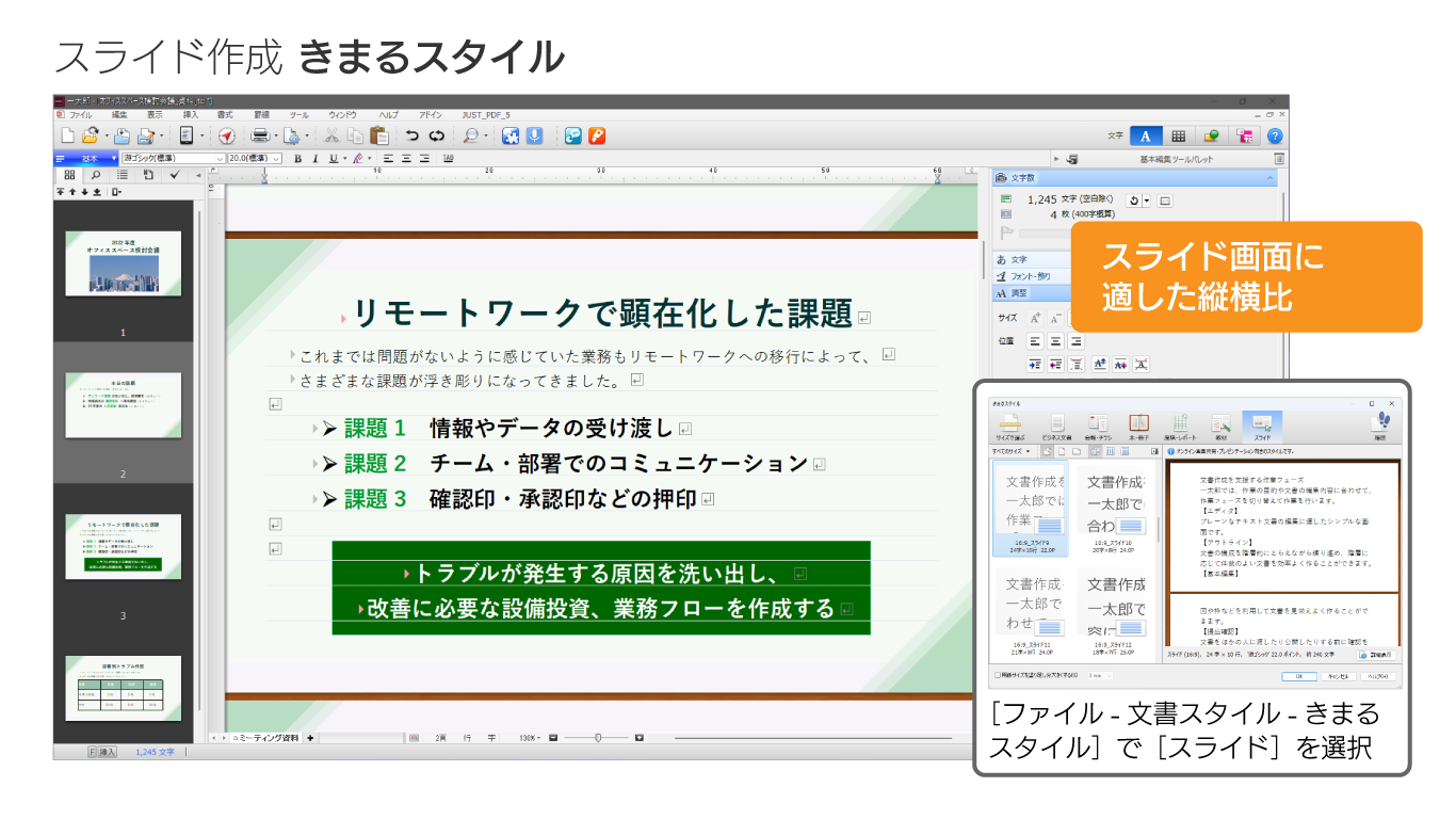 オンライン画面共有やプレゼンテーションに適した文字サイズやレイアウトなので、縦長で作られる文書を、横長の画面に適したレイアウトに変更し、手早く完成。