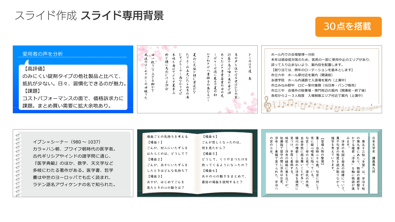 また、ビジネスや教育、趣味や交流など、オンラインでの画面共有やプレゼンテーションに適した背景用画像を30点搭載しています。