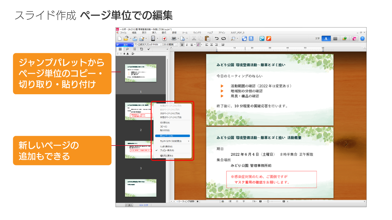 一太郎のジャンプパレットは、ページ単位でのコピー・切り取り・貼り付けや新しいページの挿入が可能です。
