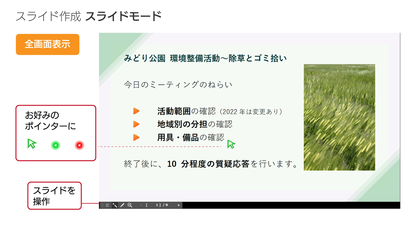 一太郎で作成したスライド文書は、「スライドモード」で全画面表示が可能。便利なスライドコントローラも利用できます。