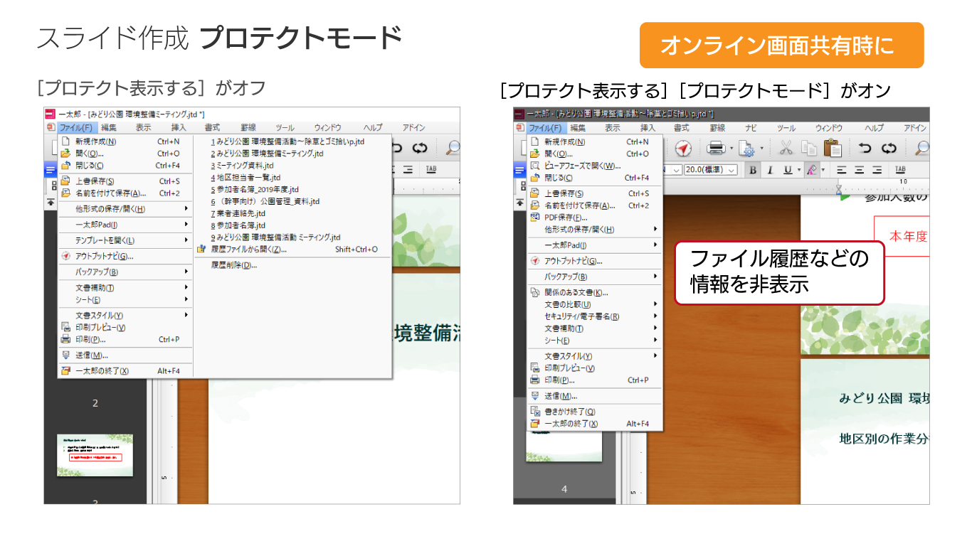 「オンラインでの画面共有に適した文書を作りたい」「画面共有したときの情報漏洩を防ぎたい」といったニーズにこたえる機能を搭載しています。