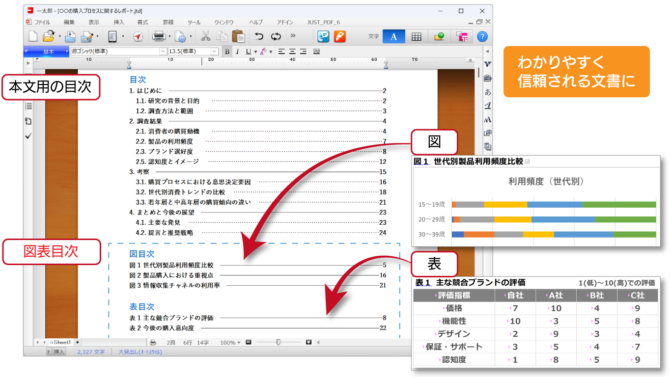 図や表が多く含まれる内容でも、必要な情報に素早くたどり着くことができ、論理の流れや構成も視覚的に示しやすくなります。