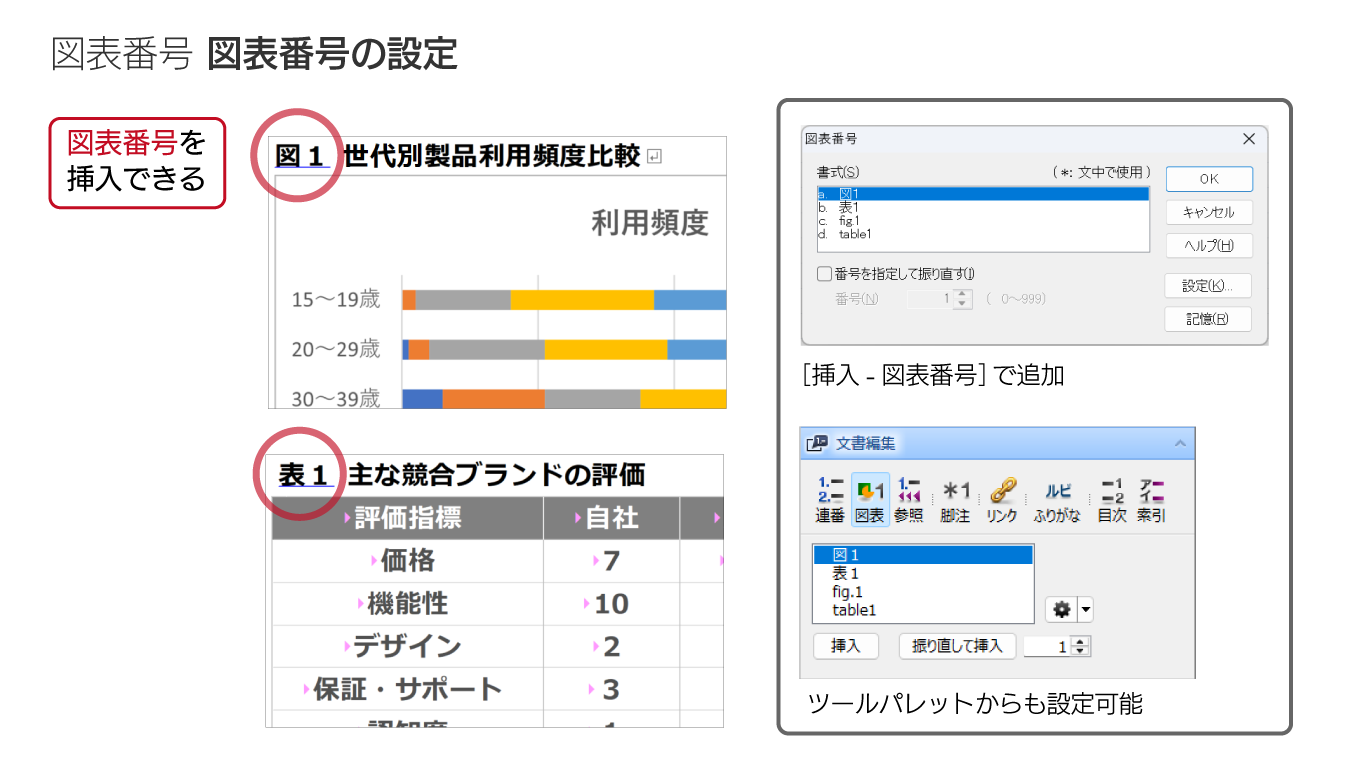 一太郎2026では図や表に「図表番号」を設定する機能が追加され、連番や参照にも対応しました。