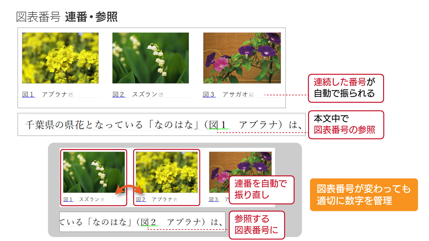 図表番号は連番と同様の機能を持っているので、連続した番号を自動的に振ることができます。また、本文中や他の図・表に参照を追加することもできます。