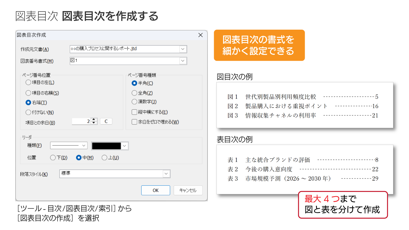 図表目次は本文の目次と同様の機能を持っており、ページ番号の位置や種類、「……」などのリーダ、書式(段落スタイルなど)を細かく設定できます。