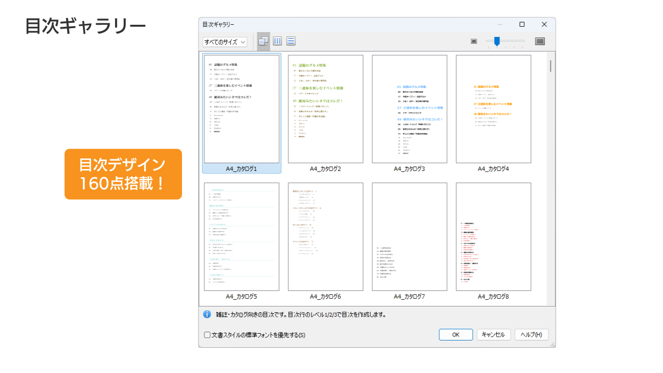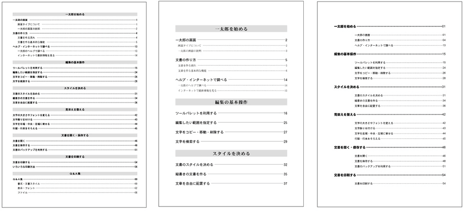 一太郎は目次行を設定し、自動で目次を作成できます。目次のデザインは、「目次ギャラリー」から選択するとスムーズ。