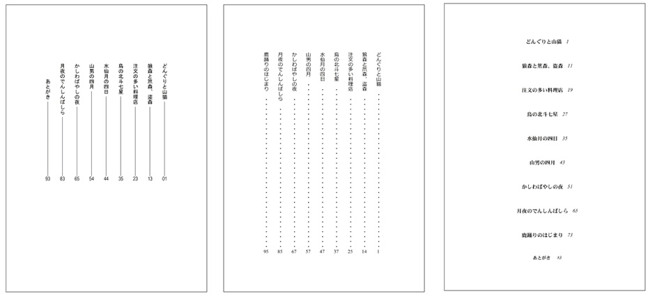 項目の左に配置するレイアウトや、ページ番号の余白をゼロで埋めるデザイン、縦組時の縦中横表示や、漢数字での表示にも対応しています。