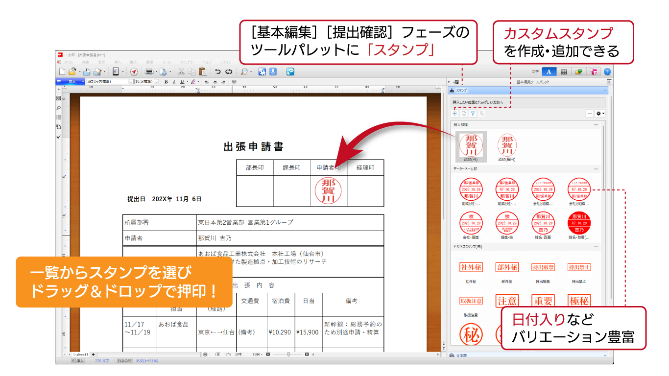 [基本編集]または[提出確認]フェーズで表示されるツールパレット「スタンプ」を開き、ドラッグ&ドロップで押印できます。