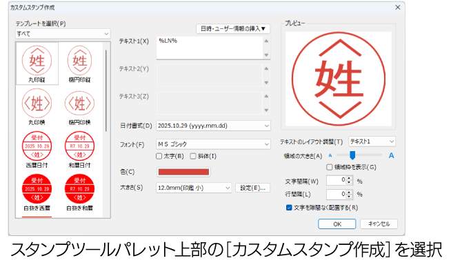 ユーザー情報やサイズを指定した電子印鑑を作成・登録し、スタンプとして文書に押すことができます。