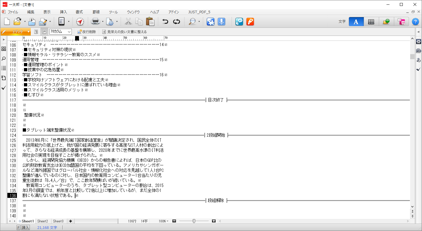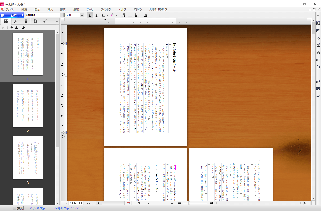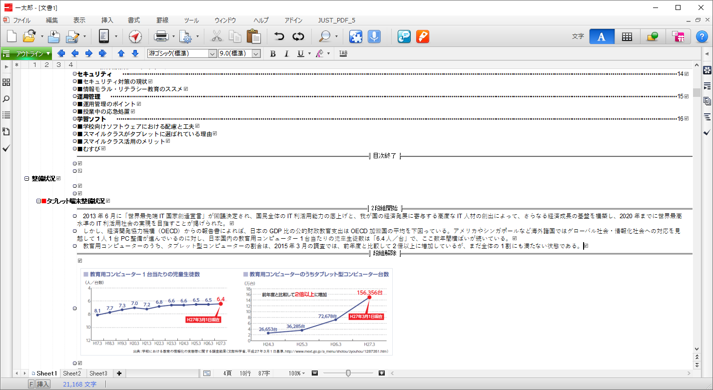 表計算のように複数の「シート」を1つの一太郎文書ファイルに保持できるので、長い文書の章ごとにシートを分けたり、一太郎形式以外のファイルを追加したりできます。