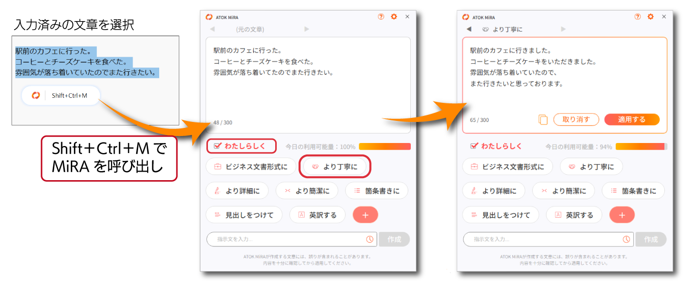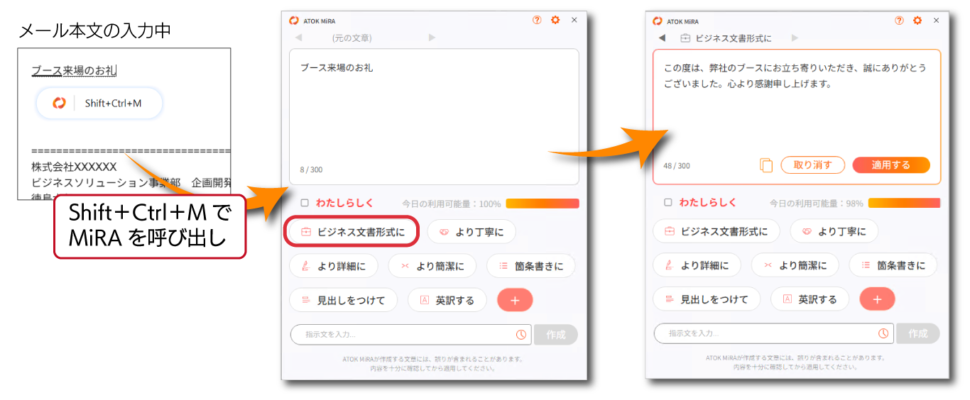 さらに文章作成をアシストする新機軸「ATOK MiRA」が登場。入力操作の延長線上でシームレスにMiRAを呼び出し、対話型の文章作成が行えます。