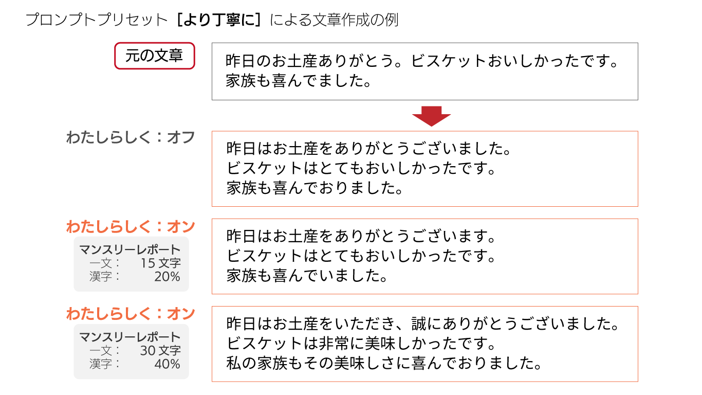[わたしらしく]をオンにすると、文章をただ書き換えるだけでなく、いまお使いのATOKでの入力に近い文体での書き換えが行えます。