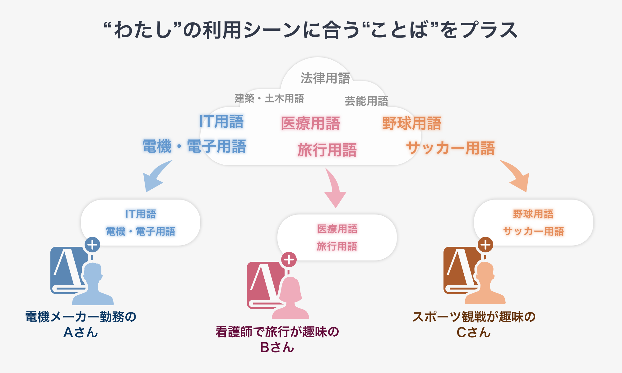 “わたし”の仕事や趣味に合った単語を変換できるようにして、より快適でスムーズな入力を実現します。