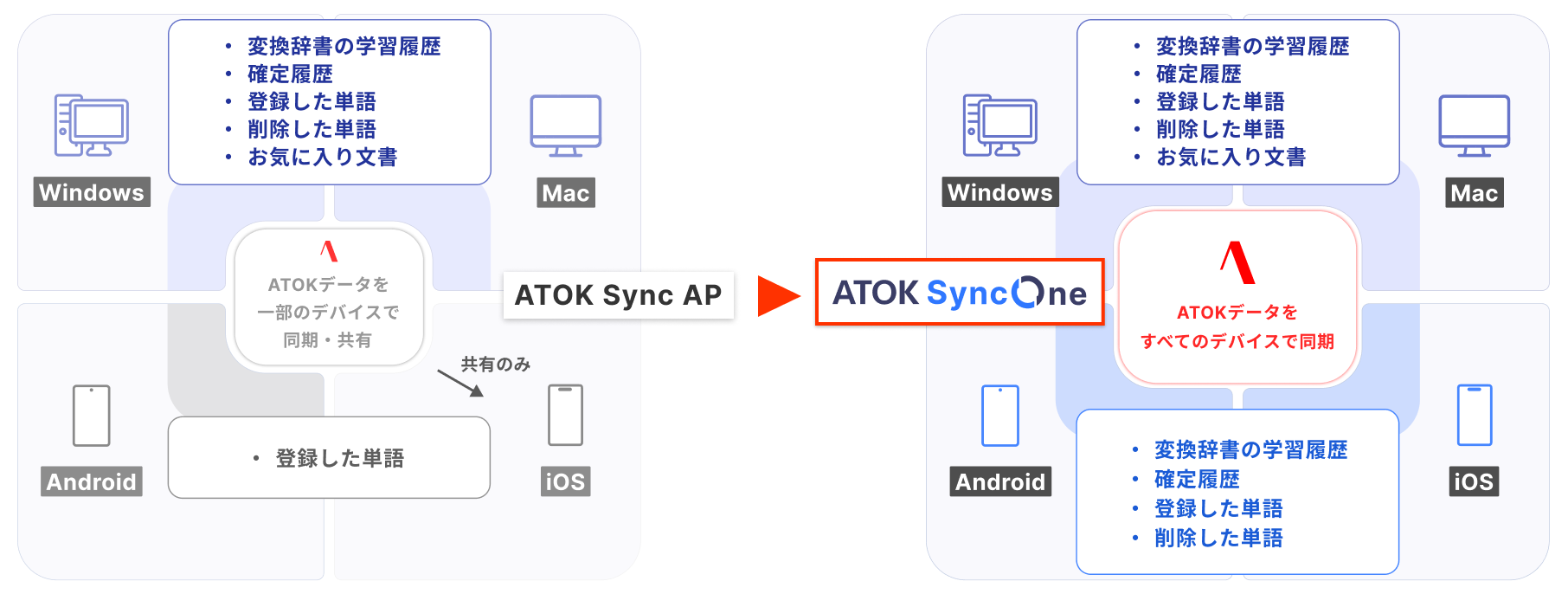 ATOK Sync Oneを使って、Windows、Mac、Android、iOSの端末間で登録した単語を同期できるので、使い慣れた自分仕様のATOKがいつでもどこでも利用できます。