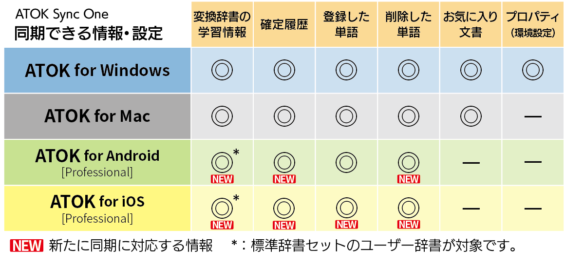 ATOK Sync One(エイトック シンク ワン)では、Android版、iOS版(ともに[Professional])で、新たに変換辞書の学習情報、学習履歴が同期できるようになります。