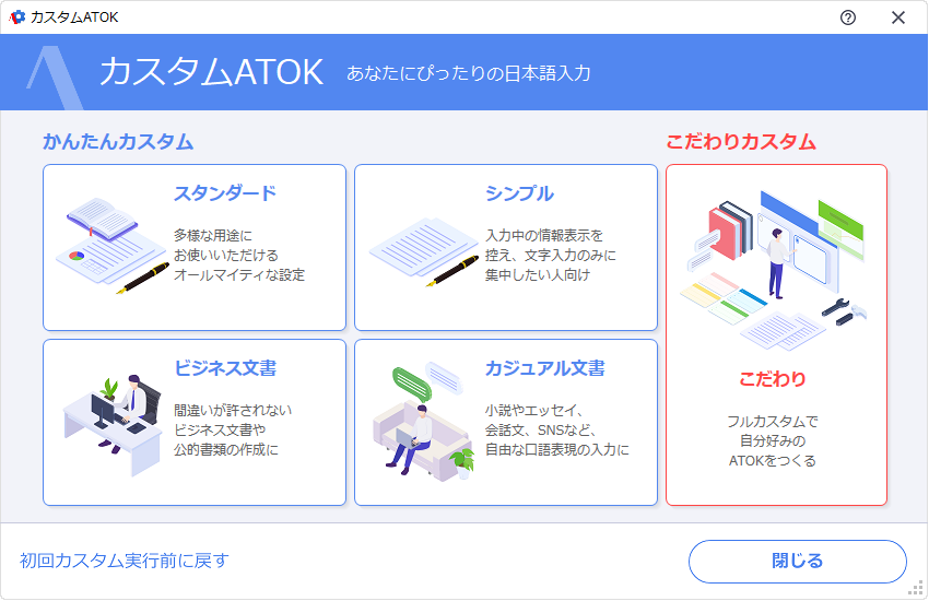 使い方のタイプを選ぶだけの「かんたんカスタム」と、用途や目的に応じた質問に答えて、あなただけの究極設定を目指す「こだわりカスタム」から、あなたにぴったりのATOKを作れます。