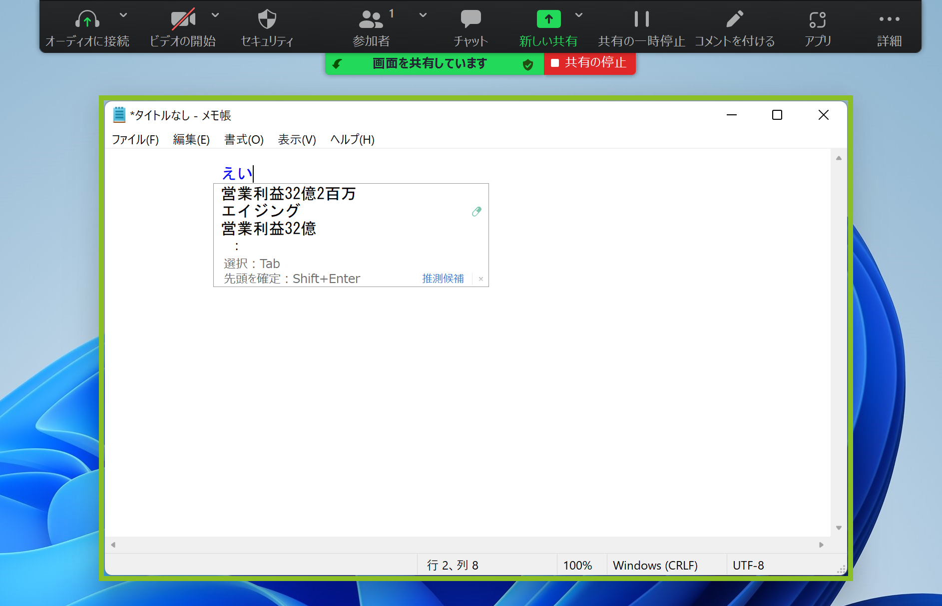Webを利用した会議で画面を共有する際、ATOKの推測変換候補に情報漏洩につながる候補や、相手に見られると困る候補が表示されないように、推測変換の候補を自動で抑制することができます。