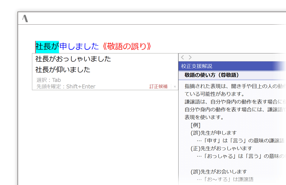 敬語の難しさは、動作の主体が誰であるかによって、使うべき表現が変わること。ATOKは「申しました」の主語として「私」は適切だが「社長」であるときは誤り、というような使い分けにも対応しています。細かい使い方はEndキーで表示される「校正支援解説」で確認できます。