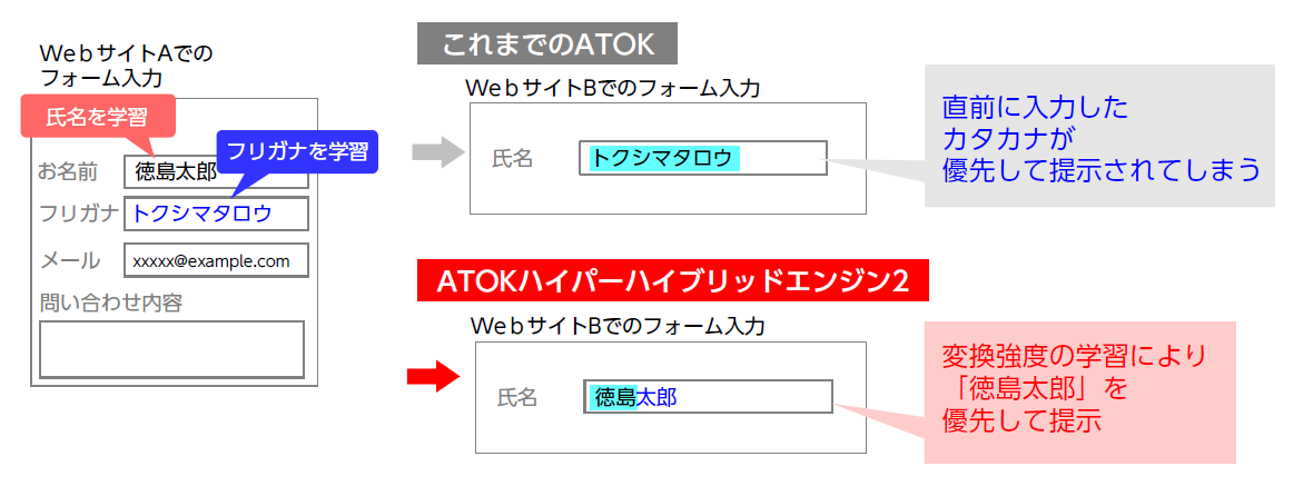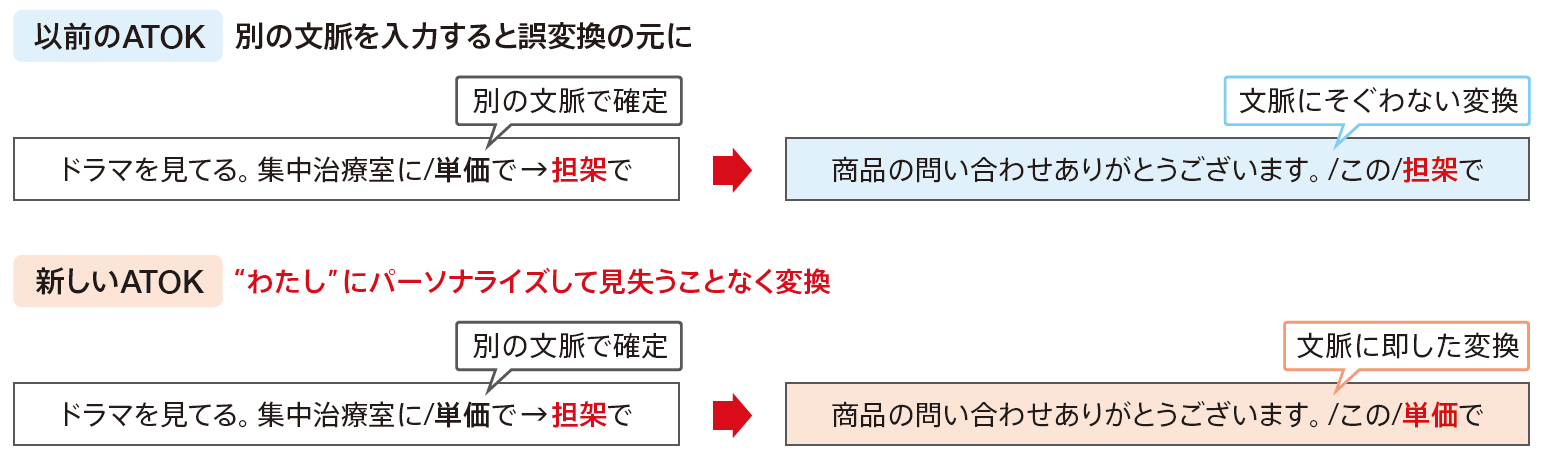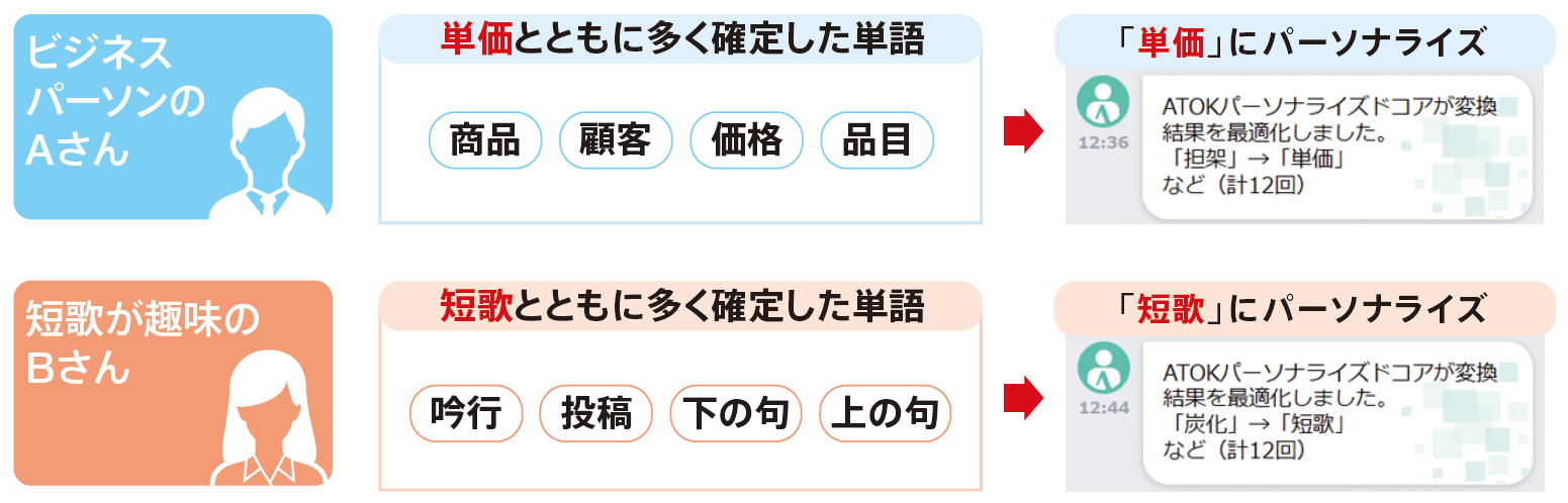 これまでの変換エンジン「ATOKディープコア2」を、「変換強度」を学習する「ATOKパーソナライズドコア」によって強化。同じ単語を学習していても、使う人ごとの入力傾向を加味し、強度に応じた最適な候補が提示されます。