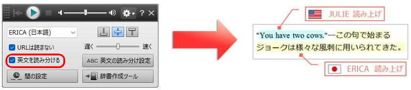 日本語文と英文に応じて、日本語話者と英語話者を自動的に切り替える機能が、一太郎の文書以外でも利用できます。