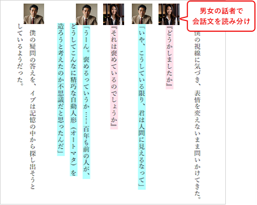詠太では、括弧で囲まれた会話文や引用符で囲まれた引用文を異なる話者で読み分けたり、英文を英語話者で読み分けたりすることができます。