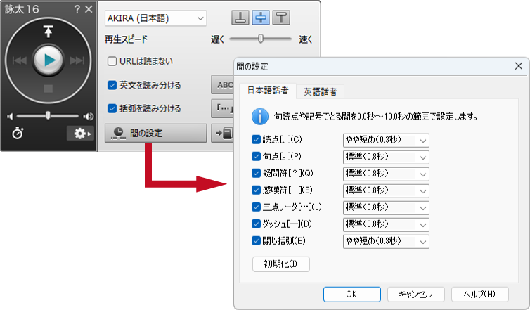読み上げのトーンや間の長短、「英文」の読み分けなど、文書の内容に適した設定が行えます。