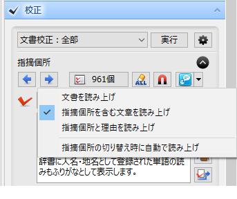 | 指摘個所と理由を読み上げ | 指摘個所の文字列と指摘理由だけを順次読み上げていきます。同時に指摘個所にカーソルが移動し、表示内容が切り替わります。 |